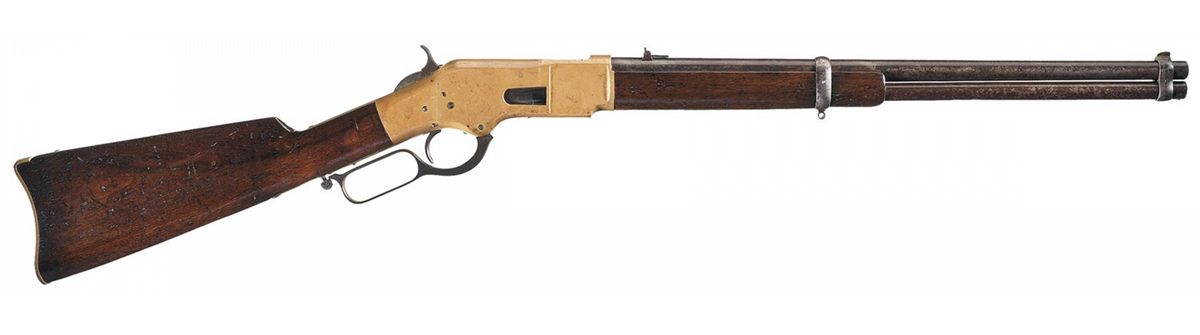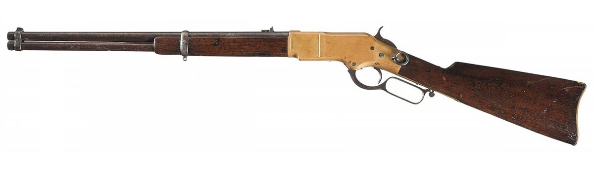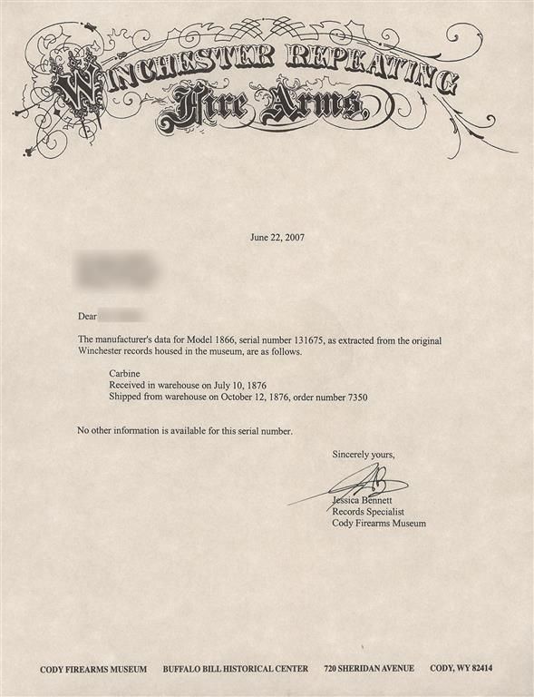 Manufactured in 1876. The top of the barrel is marked with the two line address/King's improvement patent dates, with the serial number marked on the lower tang behind the trigger. This Second Model 1866 carbine has the distinctive single upper tang screw and receiver flare at the junction with the forearm. Blade front sight integral with the barrel band and two leaf rear sight. There is a saddle ring staple and ring on the left rear of the receiver and it is mounted with a smooth walnut forearm and straight grip stock with a brass carbine buttplate with compartment (cleaning rod not included). The accompanying factory letter verifies the carbine configuration, that it was received in the warehouse on July 10, 1876 and shipped to order number 7350 on October 12, 1876.
