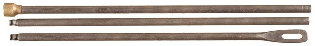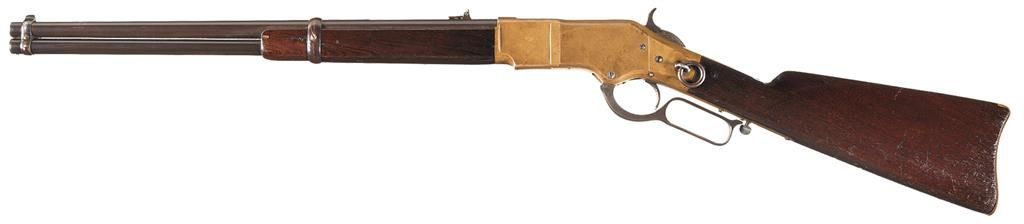 This is a fine example of a Winchester Model 1866 Saddle Ring Carbine that was manufactured in 1876. The carbine has the standard 20 inch round barrel secured by two bands with the barrel fitted with the standard two-leaf pattern carbine rear sight that is marked with graduations for 100, 300 and 500 yards. The early style front sight is mounted on the front barrel band. The top of the barrel is marked "WINCHESTER'S-REPEATING-ARMS. NEW HAVEN CT./KING'S-IMPROVEMENT-PATENTED-MARCH 29, 1866, OCTOBER 16, 1860" in two lines between lower barrel band and the rear sight. It has the brass receiver with the saddle ring and staple mounted on the left sides. The script serial number is located behind the trigger. It is fitted with the small loop loading lever with the dished loading gate. It is fitted with the correct carbine forend and buttstock with the brass carbine buttplate and the sliding trap door, which holds the brass-tipped three-piece cleaning rod. The four-piece, steel, brass tipped cleaning rod is present in the butt trap. It has the blued barrel with oil-finished walnut stock and forend.