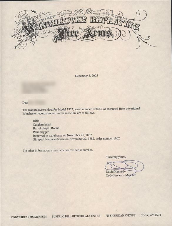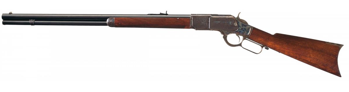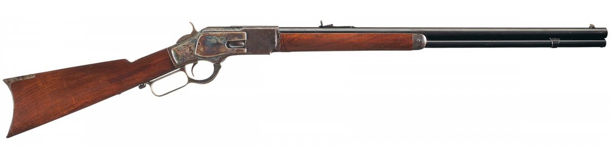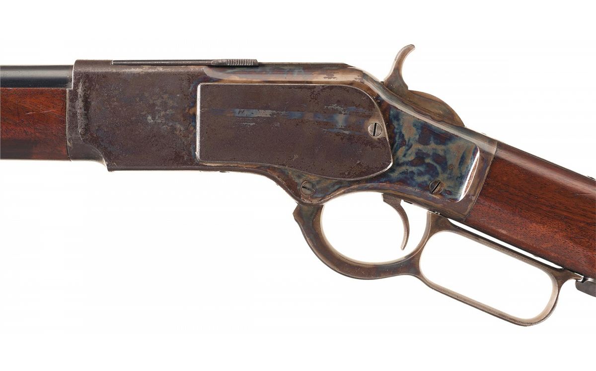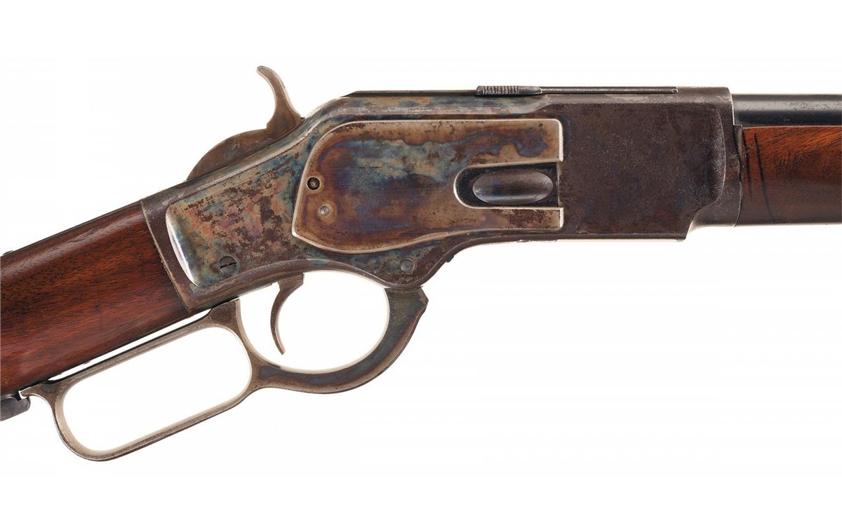 This is a nice example of a Winchester Third Model 1873 Sporting Rifle with a rare casehardened frame manufactured in 1882. This rifle is a Third Model with the dust cover rail integral to the top of the receiver. The accompanying letter describes this rifle as "casehardened" with a round barrel and plain trigger and states that it was shipped from the Winchester warehouse on November 22, 1882. The top of the barrel is marked "WINCHESTER'S-REPEATING-ARMS. NEW HAVEN. CT./KING'S-IMPROVEMENT-PATENTED-MARCH 29.1865. OCTOBER 16.1860.", the upper receiver tang is marked "- MODEL 1873-" flanked by foliate designs and the serial number is stamped on the lower tang behind the loading lever latch. There are no caliber markings on the barrel or cartridge elevator. Blade front and adjustable sporting rear sights. The rifle barrel, magazine, dust cover and loading gate are blue, the forearm cap, receiver, hammer, loading lever and buttplate are casehardened. Mounted with a smooth walnut forearm and straight grip stock with a crescent buttplate. Winchester Model 1873 Rifles with casehardened receivers are rare and extremely desirable.