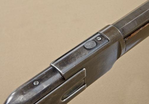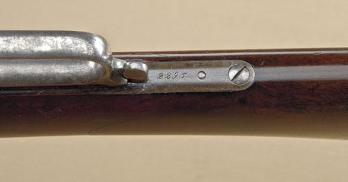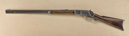 Desirable Winchester Model 1873 lever action rifle, .44 WCF cal., 28” octagon barrel, set trigger, desirable raised thumbprint dust cover, wood stocks, #2295. Copy of a 1991 factory letter confirms barrel length, settrigger and indicates the gun was received in the warehouse on September 25, 1874 and was shipped out the same day. This gun is in overall very good condition retaining a pleasing 50%-70% original bright blue overall evenly drifting to patina with some scattered light erosion and normal aging just starting and some evidence of bright original blue; the markings are sharp, the edges are crisp, the stocks show an excellent repair and small restorations with a light re-application of varnish, good wood-to-metal fit; the hammer and lever show considerable original case hardening, the sights are original, the dust cover and loading gateshow traces of bright original blue, the action is tight, the bore is near excellent. The longer-than-standard barrel and set trigger are unusual in the early ‘73s and raised thumbprint dust cover models are