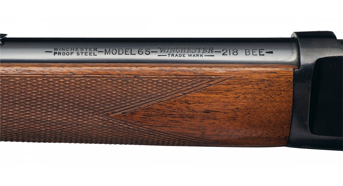 Manufactured in 1937 with a hooded ramp front sight with stippled base, filled rear dovetail slot and a bolt mounted adjustable rear peep sight. Fitted with a walnut, semi-beavertail, forearm and pistol grip stock with multi-point checkering, a hard rubber grip cap and checkered steel buttplate. Mounts for detachable sling swivels are located on the forearm cap and stock. The 24 inch barrel is standard for rifles chambered in the .218 Bee cartridge.