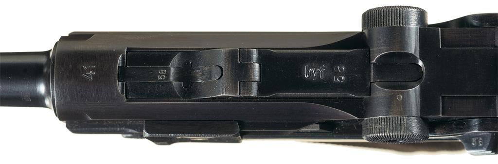 This is a scarce example of a late WWII production "Ku" marked P.08 Luger. This series of Luger was a late war assembly after normal Luger production had stopped and is theorized that the parts were manufactured by Mauser and then assembled/finished by the Krieghoff factory in late 1944/45. It is estimated that a total quantity of 5,000 were manufactured. The barrel extension of the pistol is dated "41" with the "byf" marked front toggle. It is serial number (1258) and small "Ku" serial number suffix on the left side of the barrel extension. This example has standard military markings and serial number placement. The full serial number "1258" is stamped on the frame and barrel extension only with the last two digits of the serial number "58" stamped on the various small parts. The barrel is not numbered and only carries a small "S/42" proof on the underside with a late war "Krieghoff/LZA" Luftwaffe acceptance proof on the upper left side of the barrel. This Luger comes with two all blued magazine that are stamped with only "1258 and 1258/+" on the aluminum bases. It is complete with an all black leather holster that is stamped on the back side: "KARL BUCKER/1940/WALDBROL" with an Eagle/WaA195 Waffenamt proof and take down toll with a partial proof.