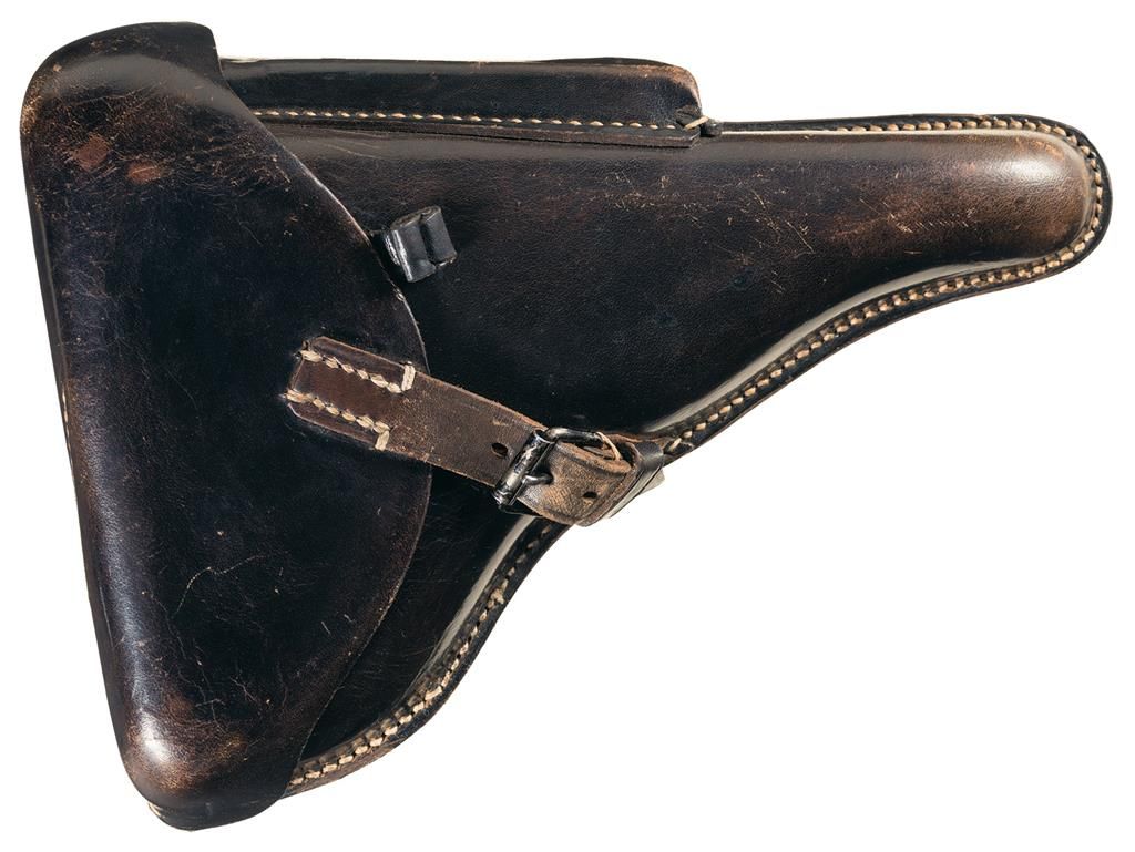 Excellent with 98% of the blued finish overall with light edge and high spot wear. The walnut grips are in excellent condition with nice sharp distinct checking on both sides with no visible handling marks. Mechanically excellent. The holster is in very fine condition with a nice even black color overall, showing minor scuffing and finish loss on the upper edges of the flap and lower toe area with tight stitching. A very nice late war KU P.08 Luger rig.