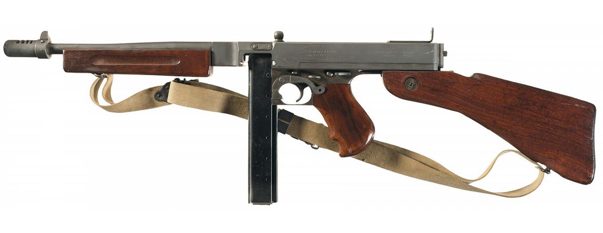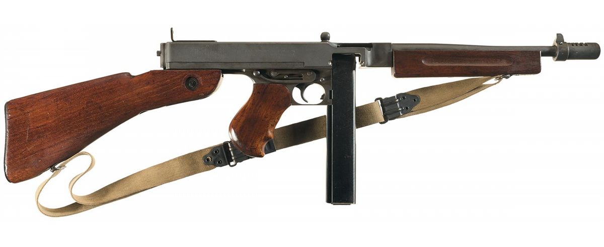 This is an exceptional example of an original WWII Model 1928A1 Thompson submachine gun that was manufactured by the Auto-Ordnance Company. This weapon was originally manufactured as a late model 1928A1 under a US Government contract that was subsequently refurbished by the US Army after WWII. This specific weapon has been fitted with many of the later wartime features that are highly desirable and so easily recognized in the WWII movies such as; short 10 1/2 inch, non-finned barrel with ported "CUTTS" marked compensator on the end, the wartime horizontal forend, detachable buttstock and non-adjustable Lyman stamped "L" pattern rear sight. The receiver is marked with "US MODEL OF 1928 A1/NO. A.O. 101383" and farther back "THOMPSON SUBMACHINE GUN/CALIBER .45 AUTOMATIC CARTRIDGE. The obverse is marked in two-lines "AUTO-ORDNANCE CORPORATION, BRIDGEPORT CONNECTICUT USA" The top of the receiver is marked with the "Thompson Bullet" logo and the underside of the lower trigger group is numbered "No.S-467214". The upper right side of the buttstock, has the correct "A.A" Augusta Arsenal rebuild proof stamp. Documentation with this machine gun shows it was sent to the Anniston Ordnance Depot in February of 1961. This desirable Thompson SMG is complete with one blue 30 round stick magazine with an original KERR no-buckle canvas sling.