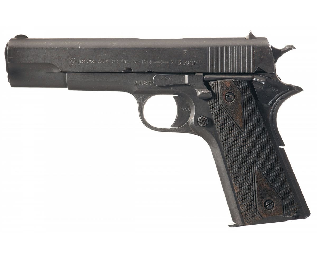 This is a desirable late production, M1914 Norwegian, 45 ACP pistol as manufactured during WWII by the Kongsberg factory. These pistols were a close copy of the Model 1911 semi-automatic pistol intended for the Norwegian Army until the capture of the Government Arsenal at Kongsberg by the Germans in 1940. They were manufactured from 1940 to 1945, with this specific pistol falling into the late serial number range of the pistols delivered to Nazi Occupation Forces in 1945. The slide is marked with a Waffenamt "WaA84" proof, followed by: "11.25 m/m AUT. PISTOL M/1914/No. 30062" followed by a "Crown K" proof of the Kongsberg factory, with the right side dated 1945. On page 76 of Axis Pistols by Jan Still, he states the range of these Waffen Variation Norwegian M1914's to be in the serial range of 29621-30523, of which this example falls right in the middle of; 30062. It has a replacement "S" Code U.S. M1911A1 45 magazine with no lanyard loop on the base plate. These are very desirable pistols as very few were produced during the occupation, and production of these never really resumed after the war.