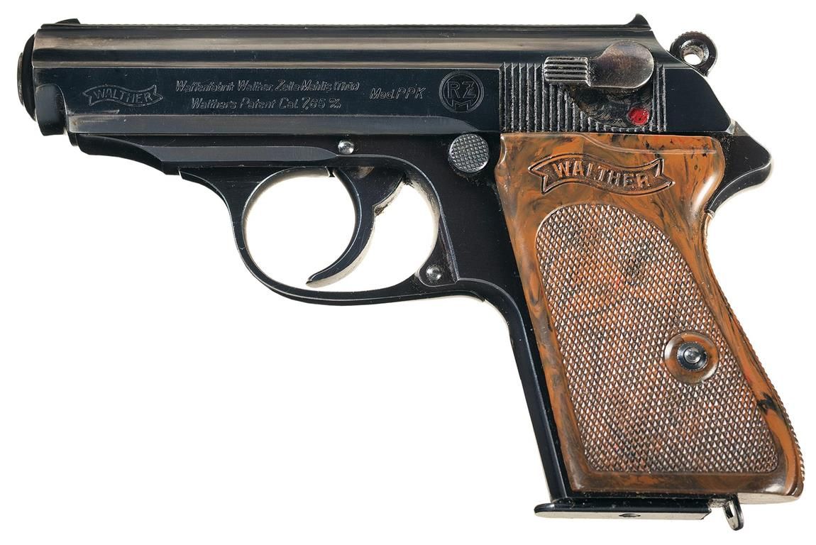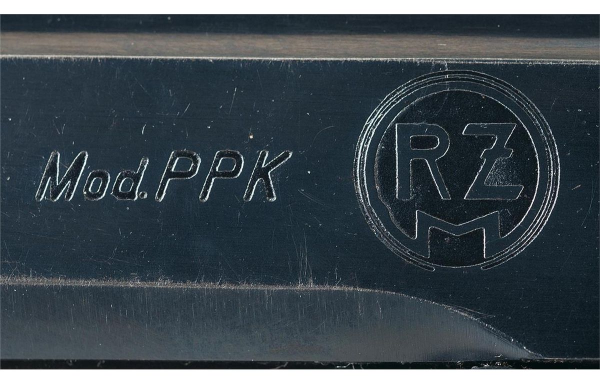 This a very desirable WWII Nazi Walther PPK, with the "RZM" slide markings. The "RZM" markings stood for Reichs Zeugmeisterei who served as the procurement and quartermasters office for the SA, NSDAP and SS prior to WW II. The left side of the slide is marked with the Walther banner followed by the two line address/caliber designation, "PPK" and the circle "RZM" control mark. The slide has a 90 degree safety lever. The commercial "Crown/N" proof is on the right side of the slide, chamber area and muzzle. The serial number is marked vertically on the right side of the frame. The pistol has the high polish commercial blue finish and is fitted with one piece wraparound brown plastic checkered grips and the Walther Banner at the top. It is complete with two flat bottom magazines; both are blue and have the Walther banner logo on the lower left side.