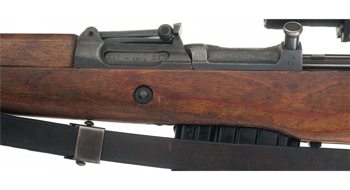 Fine overall, 80% of the blue finish with even honest wartime use and finish loss on all the exposed metal surfaces. The stock and handguard are both very good with their original finish mixed with numerous handling marks and light pressure dents with clear visible markings and a flat spot on the underside of the stock with various hash marks cut into the stock. The scope and mount retain 90% of the wartime finish. The optics are clear and the strap for the scope cap/wooden plug is torn in two. A nice example of a wartime G43 semi-automatic rifle with Nazi ZF4 Scope and mount.
