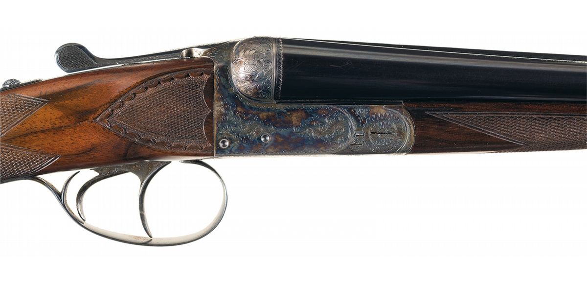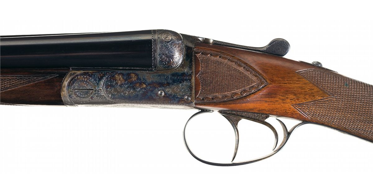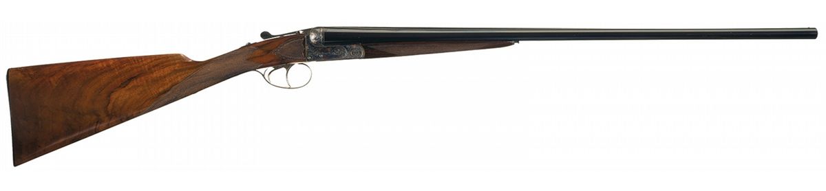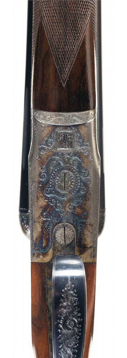 This beautiful example has a generous amount of floral scroll engraving on the receiver, trigger plate, trigger guard, break lever, safety switch and forearm hardware. The top of the right barrel is engraved "ABERCROMBIE & FITCH CO/MADE IN BELGIUM" and the left barrel is engraved "U.S. AGENTS NEW-YORK". The left side of the receiver is engraved "A. FRANCOTTE MAKER & PATENTEE/LIEGE BELGIQUE". The bottom flat of the barrels have the various proofmarks, the chamber length "2 7/8" and the choke constriction is engraved on the bottom of the barrels (left ".529"/right ".544"). There is a single brass bead sight on the hand matted rib. Mounted on a nicely figured, multi-point checkered splinter walnut forearm and straight grip stock with checkered flats and a checkered horn buttplate. Length of pull is 14 1/4 inches.