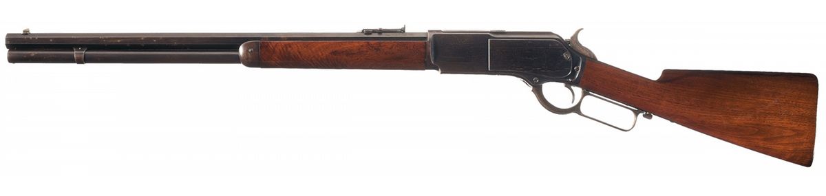 Condition: Extremely fine. The rifle retains 85% plus of the original blue finish overall. The forearm cap and buttplate retain 70% of the blue finish. The loading gate retains 70% niter blue. The hammer and lever have 75% of the casehardened finish intact with strong case colors.The barrel and receiver markings are crisp. The stock and forearm are both excellent and retain nearly all of the original varnish finish; wear is limited to several, very minor, storage and handling marks. This is an excellent example of a Winchester Model 1876 "Centennial" rifle in the very scarce special order "Short Rifle" configuration.