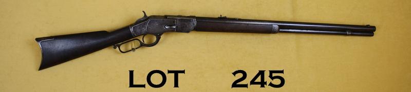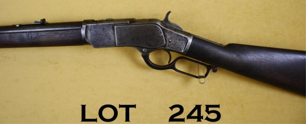 Desirable early thumbprint dust cover Winchester first Model 1873 lever action rifle, .44 cal., 24” round barrel, blue finish, wood stocks, #2488. This gun is in overall good condition showing a dark brown patina on metal surfaces with scattered spots of erosion and pin prick pitting, some older light cleaning to the sides of the receiver, fairly decent bore with some spots of pitting, good action and markings, overall good wood with wear and weathering but complete and tightly matched wood-to-metal fit. A hard-to-find early ’73 that is classic in appearance and would be a prize for any serious Winchester enthusiast’s collection. Est.: $4,000-$8,000.