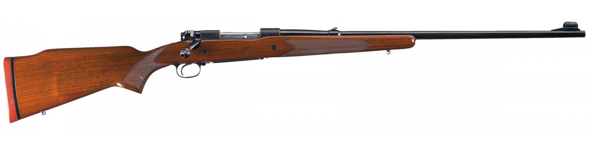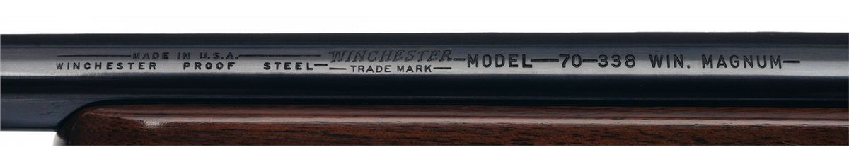 Manufactured in 1959 in the desirable 338 Winchester Magnum caliber. Standard markings, hooded ramp sight and adjustable fold down leaf rear sight. Drilled and tapped for scope with filler screws. Pistol grip stock with checkered forearm and grip area, hinged floor plate, jeweled bolt, sling swivels and solid red Winchester recoil pad.