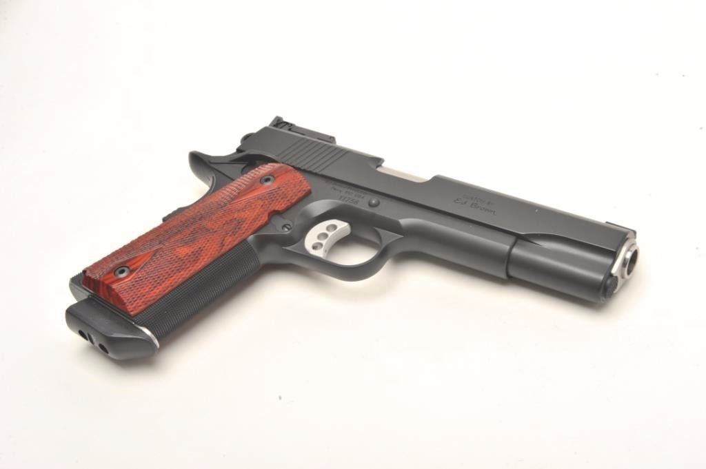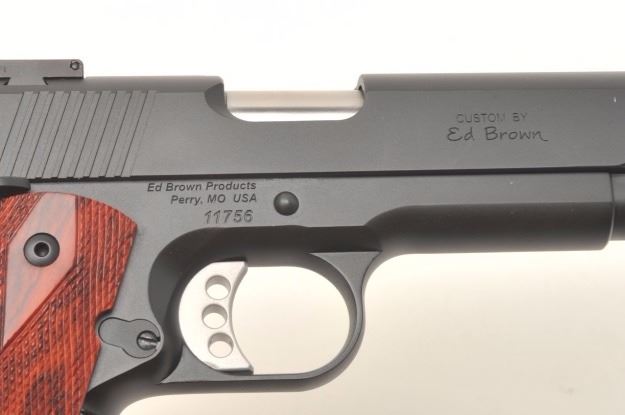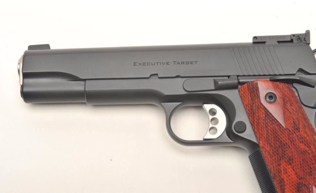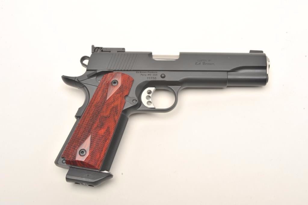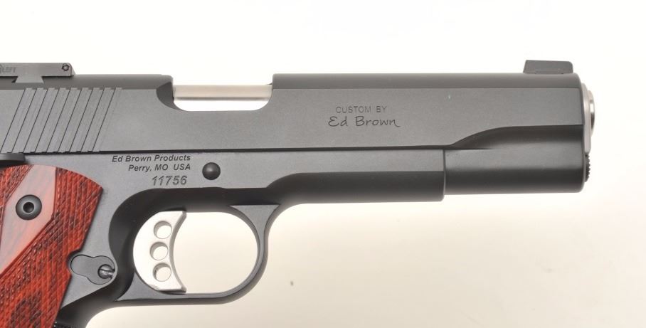 Desireable custom 1911 Executive Target by Ed Brown, .45 ACP pistol, #11756. 5" stainless Bbl, adjustable sights, adjustable trigger, checkered rosewood grips, matte black finish. Pistol is in excellent condition, seeinglittle use. Includes original paperwork, lock and carrybag. Includes one 7 round magazine. Replacement value approximately $3500. Est. $1500-3000. (Modern, PPT)