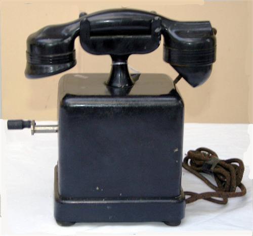 Black table model telephone with large base. Hand crank. Monophone American Elec. Company. Base measures approximately 5" x 6" x 6" H.