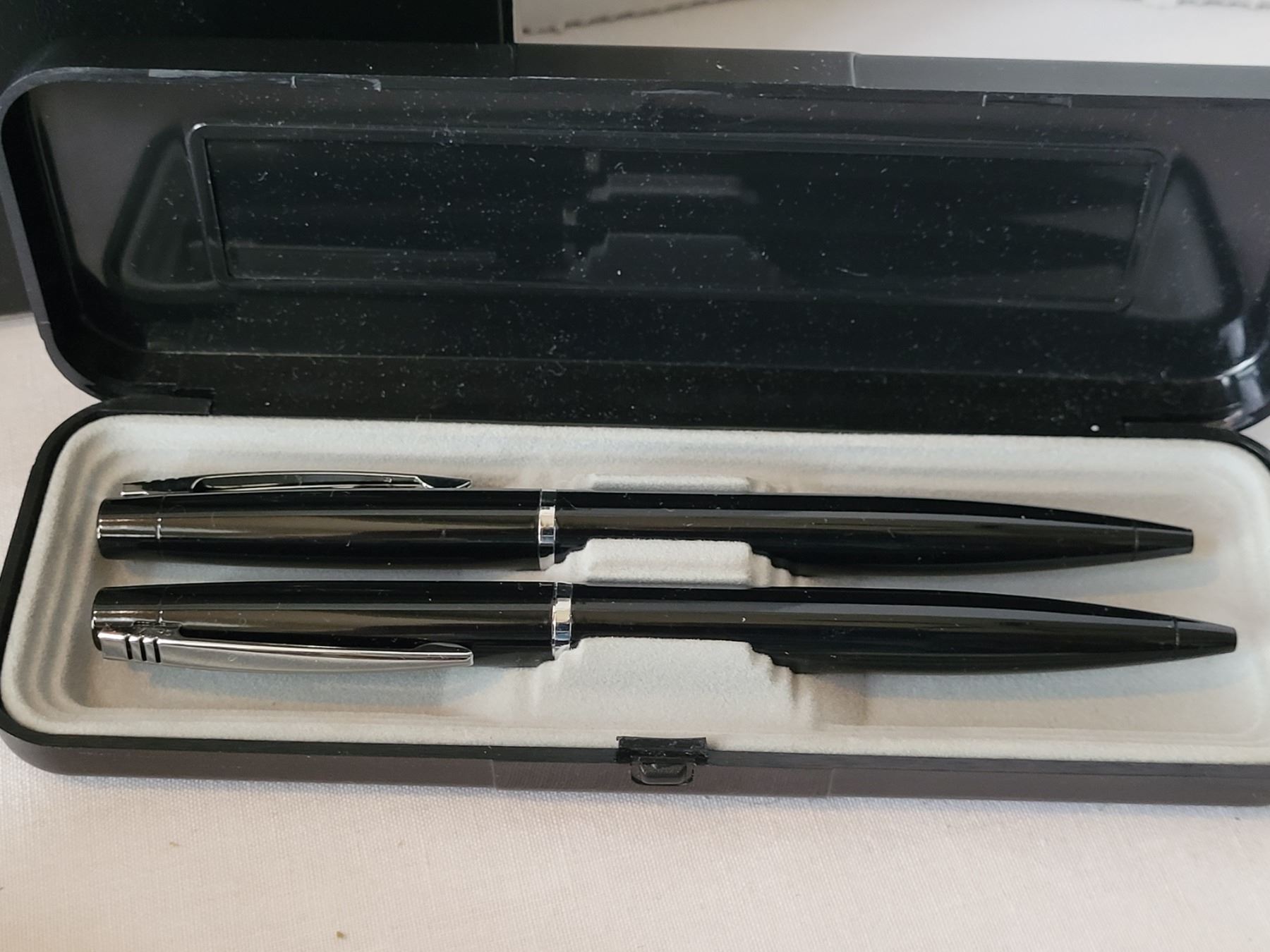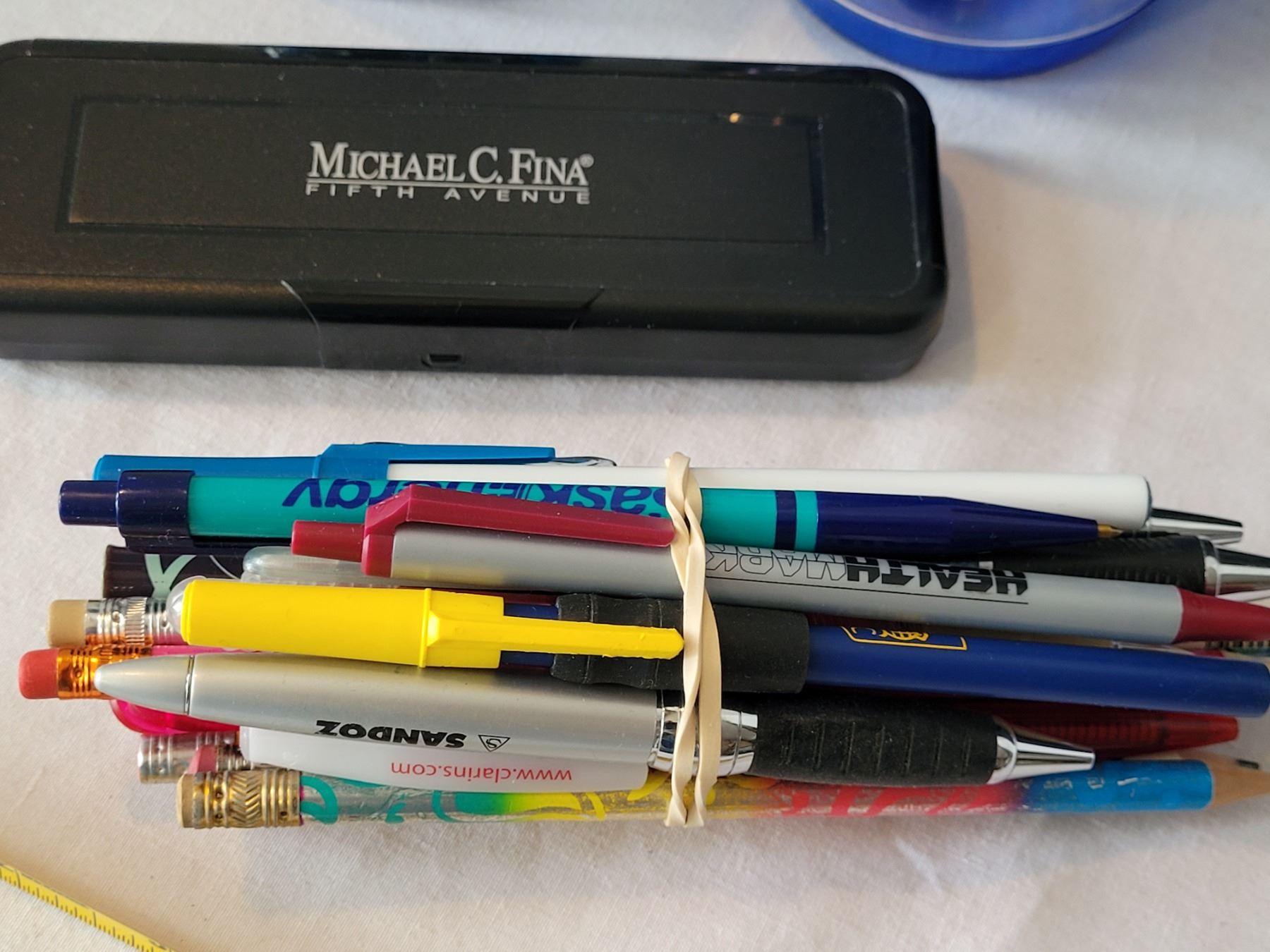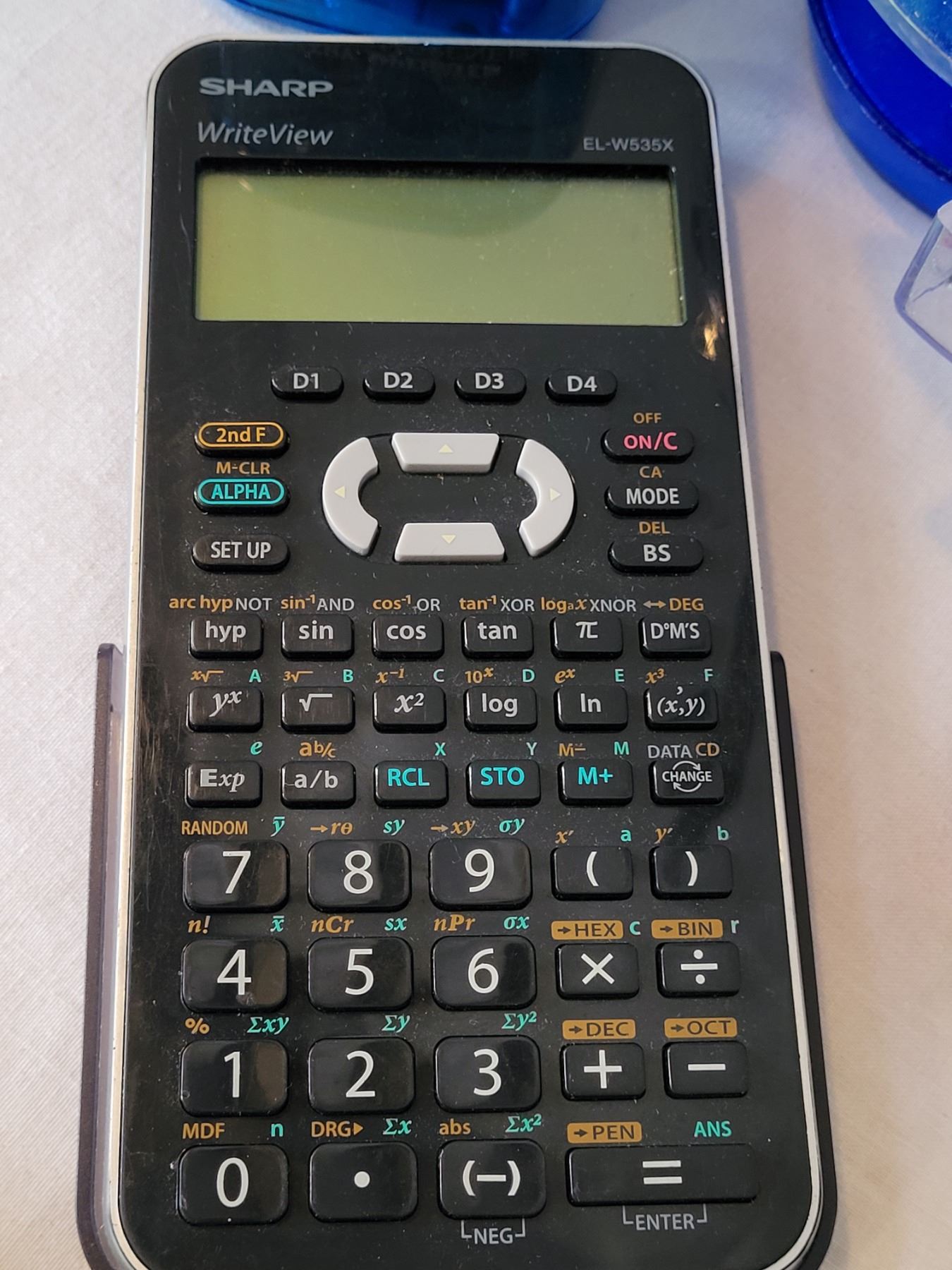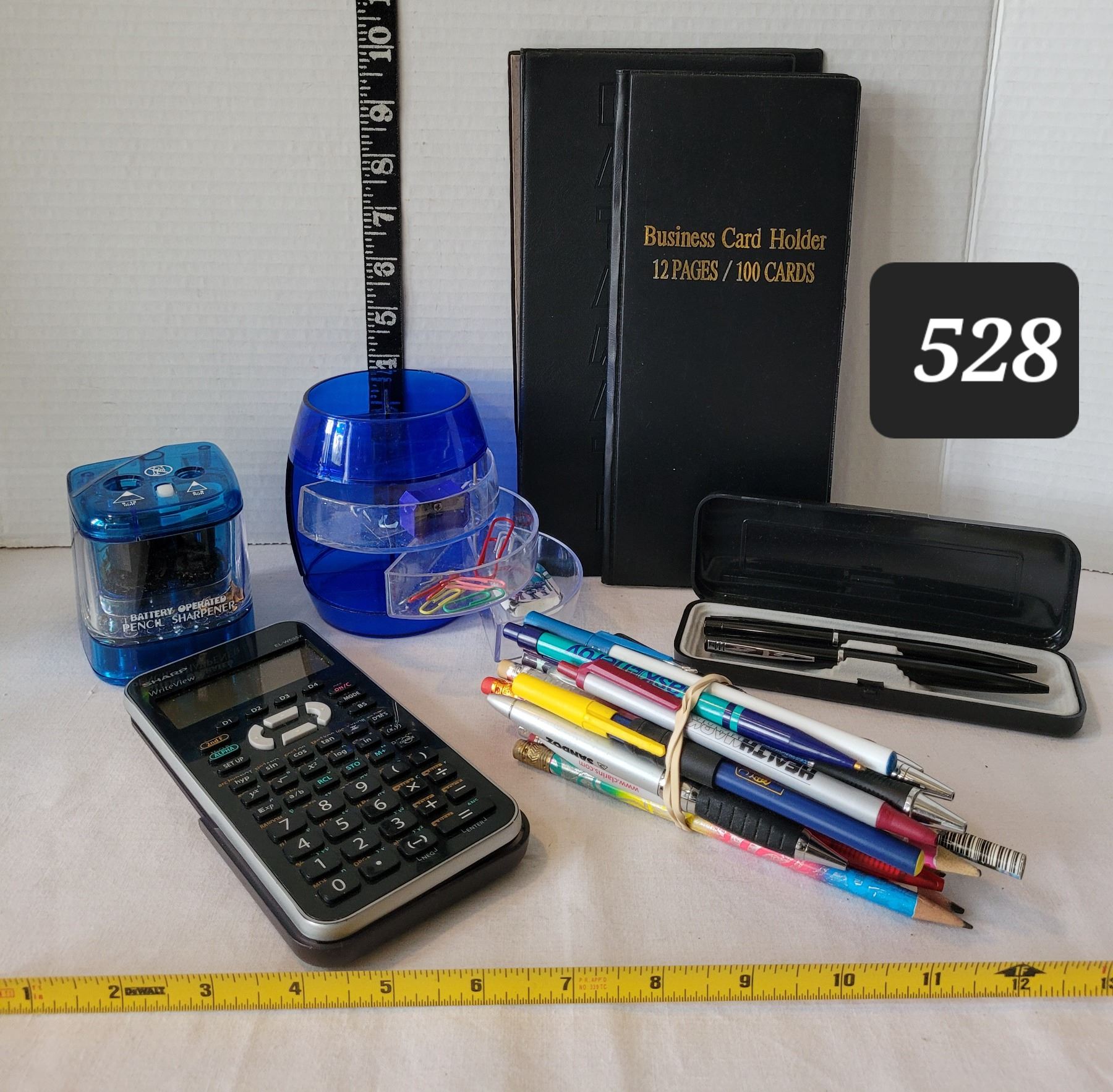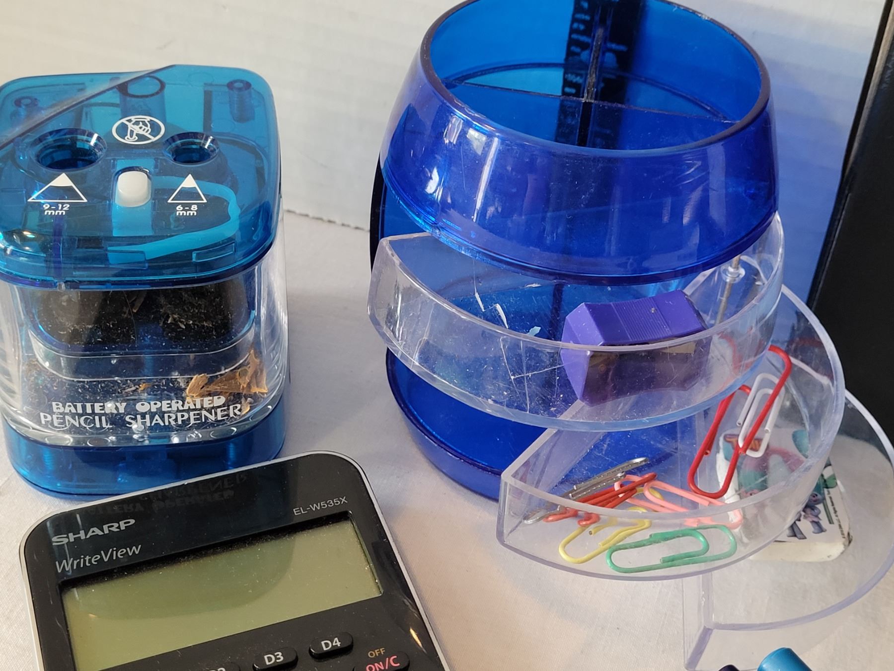 Desk accessories. Sharp calculator, pens, sharpener etc.