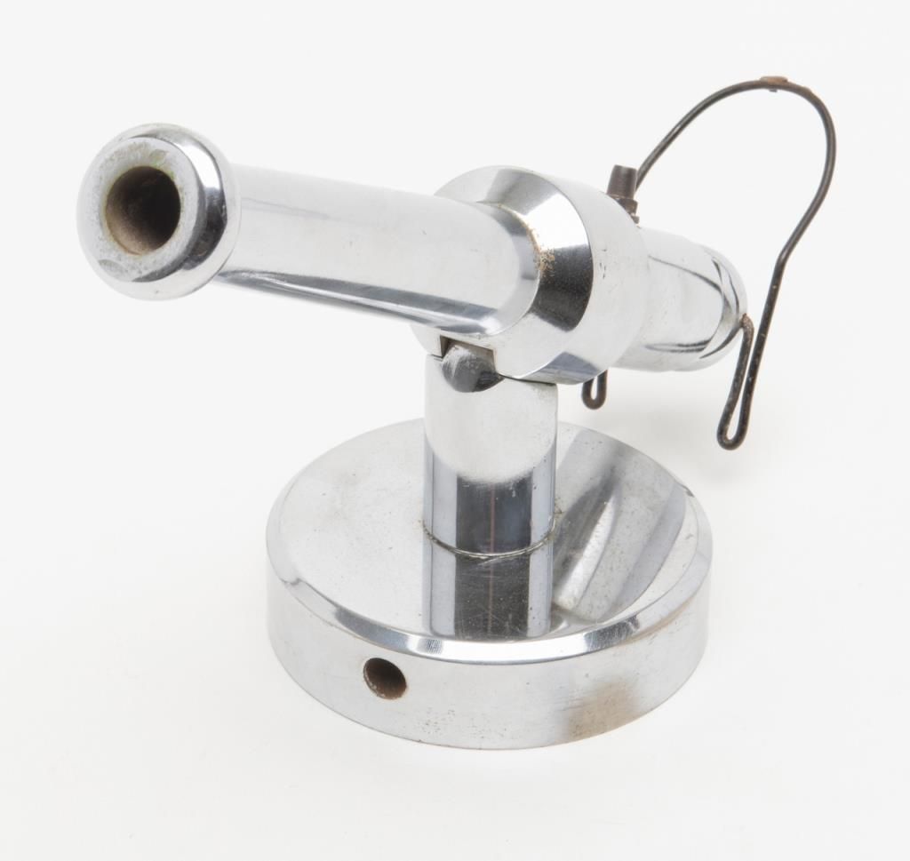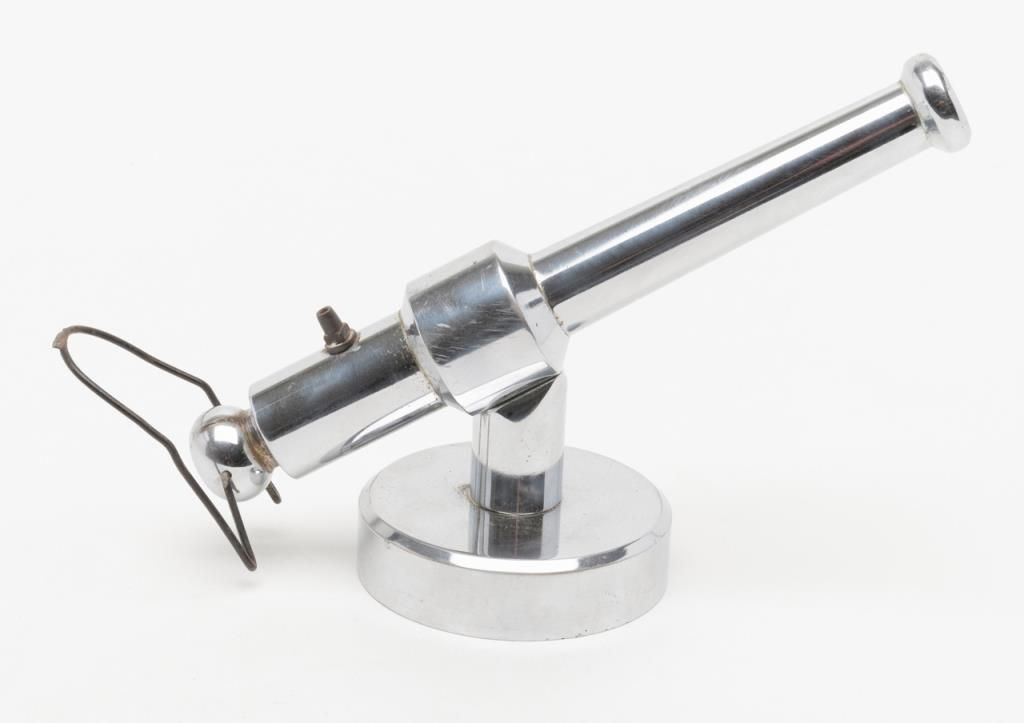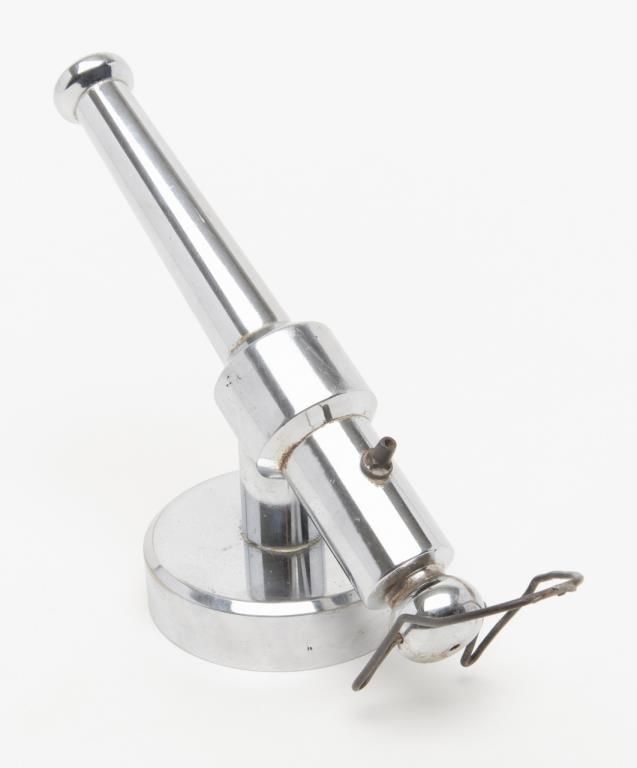 Desk-size percussion heavy nickel plated percussion signal cannon, approx. 10” in length of barrel on round base, in overall fine condition; a great for a small craft, conversation piece or perfect mechanism to announce when that staffmeeting has gone a little too long. Est.: $100-$200.