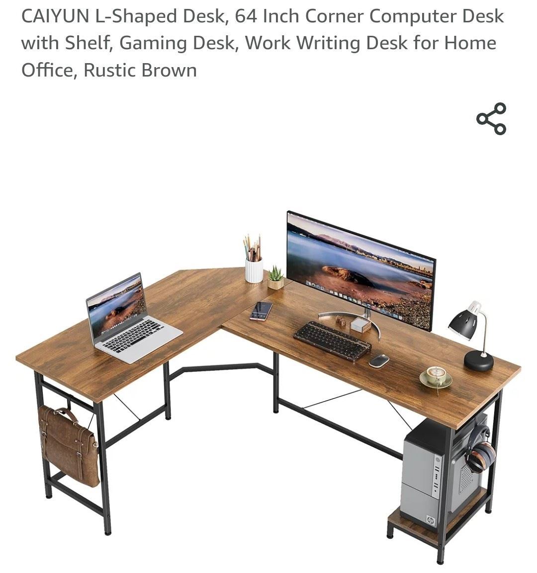 Spacious 64-inch corner desk with storage shelf, ideal for gaming or office work, new.