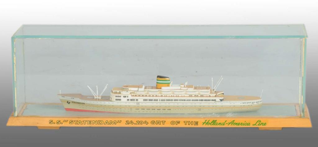 Complete and all original nicely detailed piece. Boat and base are made of wood and the top dome is glass. Hazing to the glass but in fair to good condition. Boat and wooden platform are in excellent condition. Scarce item. Size 13" x 4".