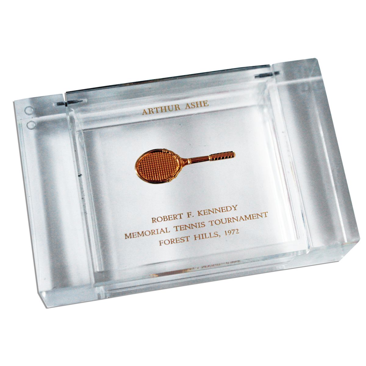 Arthur Ashe desk keepsake from the 1972 RFK Memorial Tennis Tournament. The celebrity tournament was held on 26 August of that year at Forest Hills Stadium in New York, New York. Lucite box features a hinged lid with a golden tennis racquet inside and print reading: ''Robert F. Kennedy / Memorial Tennis Tournament / Forest Hills, 1972''. Measures 5.5'' in length, 1.5'' in height and 3.5'' deep. Very minor surface abrasions. Near fine. With an LOA from Arthur Ashe's widow.