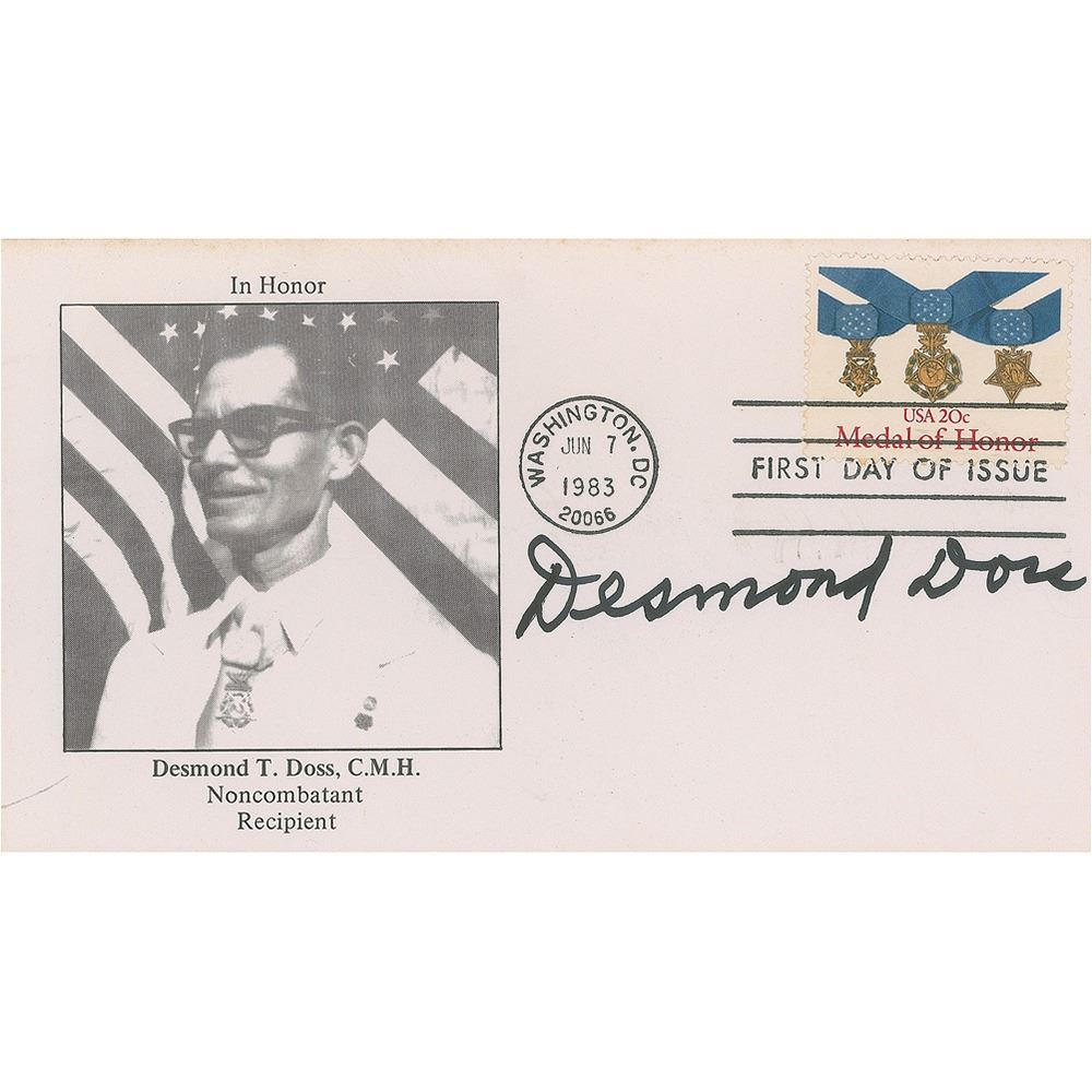 FDC with a portrait cachet of Medal of Honor recipient Desmond T. Doss, signed in bold black felt tip. In fine condition.