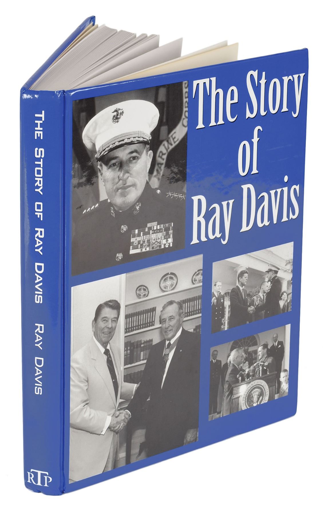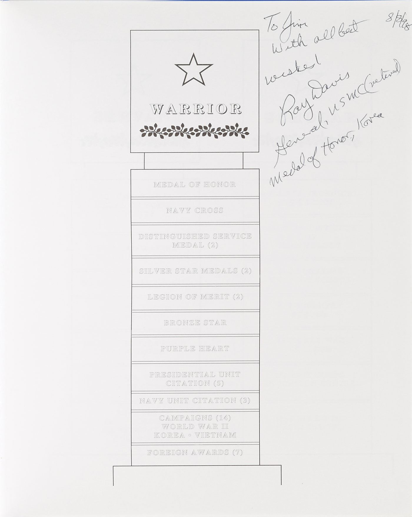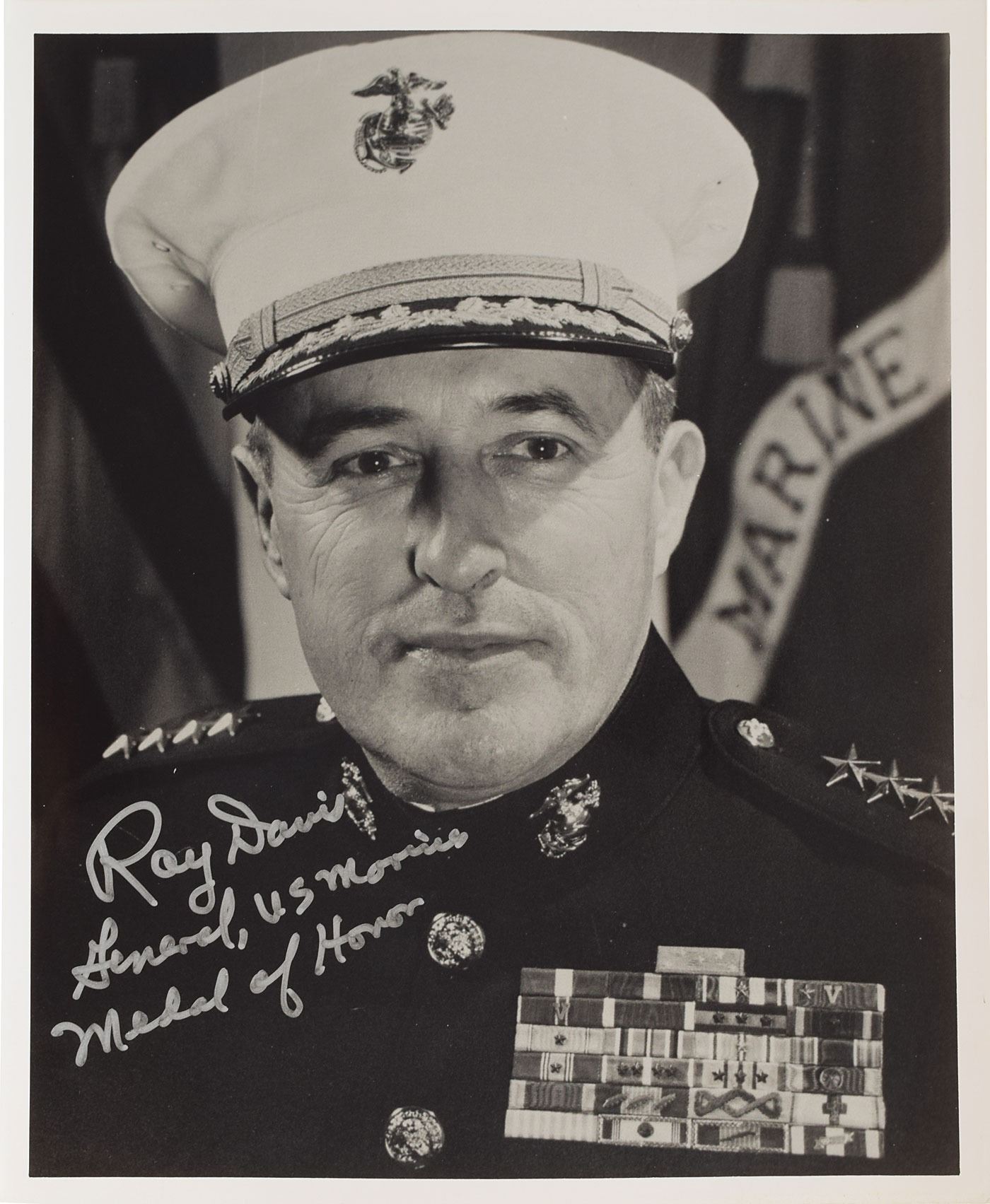 The Davis items include: a first edition of The Story of Ray Davis, hardcover, published by Research Triangle Publishing in 1995, signed and inscribed on an opening page in black ballpoint, "To Jim, with all best wishes! Ray Davis, General, USMC (retired), Medal of Honor, Korea, 8/8/98." Affixed to the first free end page is a Post-It note annotated and signed in black ballpoint by Davis: "Note, Photo on pg 14 not available—maybe copy from book? Substitute photo enclosed. Ray Davis." Also included is a glossy 8 x 10 photo of Davis in his military uniform, signed in silver ink, "Ray Davis, General, US Marines, Medal of Honor." In overall fine condition.