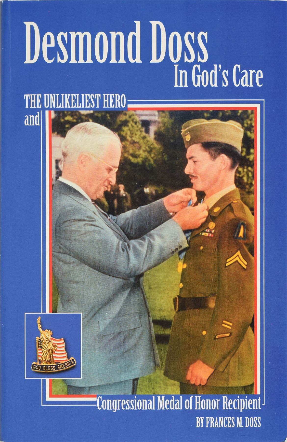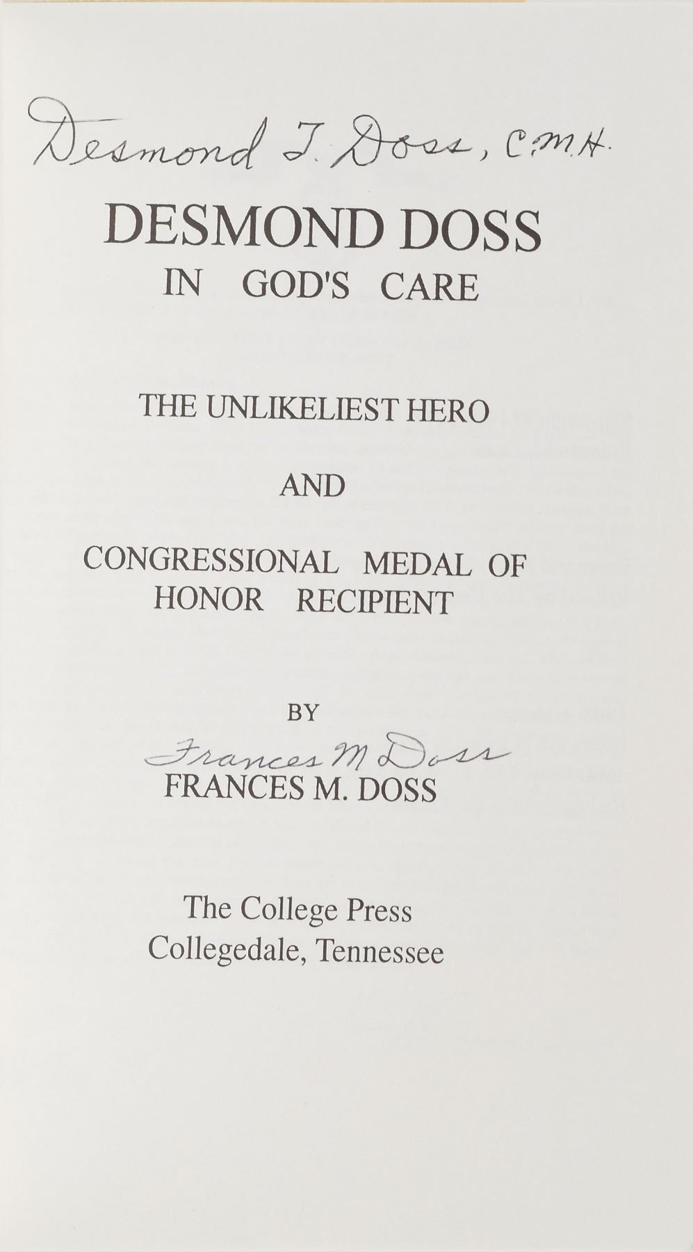 Group lot of four items signed by Medal of Honor recipients, including a book signed by Desmond Doss and three items signed by Ray Davis. The Doss item is a softcover copy of Desmond Doss In God's Care, published by the College Press in 1998, signed on the title page in black ballpoint by the hero of Hacksaw Ridge, "Desmond T. Doss, C. M. H.," and by his wife and the book's author, "Frances M. Doss." Includes the original mailing envelope for the book, which has been addressed in Doss's own hand. Doss's life was the subject of the recent Oscar-winning film Hacksaw Ridge.