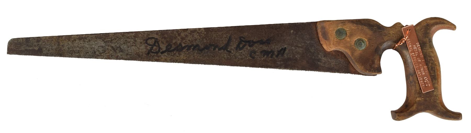 Desmond Doss's personally-owned and -used crosscut hand saw with open wooden handle, measuring 19.75? in length, marked on the handle, "25–01–9900," and signed on the blade in black felt tip, "Desmond Doss, CMH." Affixed to the handle is an impressed bronze ID tag, "Desmond T. Doss, Medal of Honor, Personal Effects—Artifacts, 027." In very good condition, with expected signs of use and age. Accompanied by a letter of provenance from his pastor and longtime friend, Les Speer.