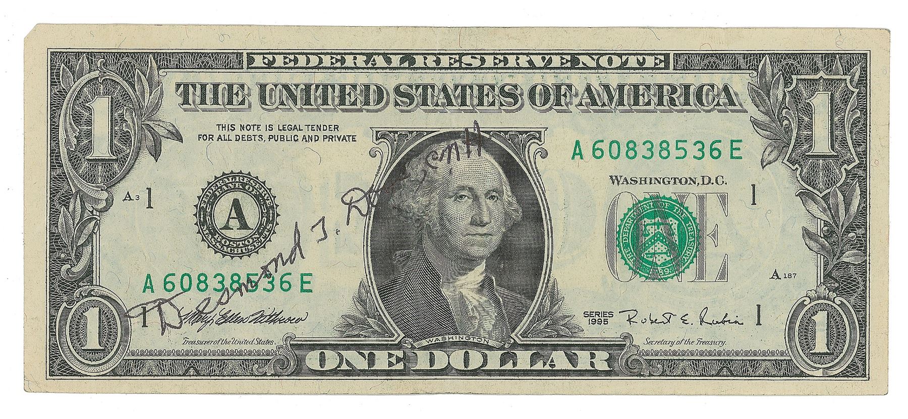 Combat medic with the 77th Infantry Division in World War II, who famously saved 75 men during the Battle of Okinawa (1919–2006). His heroic actions not only earned him the unique distinction of becoming the first and only conscientious objector to receive the Medal of Honor during World War II, but his story was later vividly retold in the Oscar-winning 2016 film Hacksaw Ridge. Series 1995 one-dollar bill, signed in black ballpoint, "Desmond T. Doss, CMH," signifying his receipt of the Congressional Medal of Honor. In fine condition. Consignor notes that this was signed in person at an Independence Day parade in Atlanta on July 4, 1997.