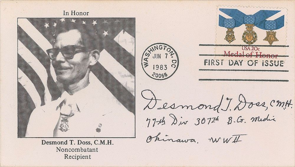 United States Army corporal (1919–2006) who served as a combat medic with the 77th Infantry Division in World War II. He saved 75 men during the Battle of Okinawa and became the first and only conscientious objector to receive the Medal of Honor during World War II. The Oscar-winning 2016 film Hacksaw Ridge is based on Doss's wartime heroics. Rare FDC with a portrait cachet honoring Congressional Medal of Honor recipient Desmond T. Doss, signed in black ballpoint, "Desmond T. Doss, CMH, 77th Div 307th B. Co. Medic, Okinawa, WWII." In fine condition.