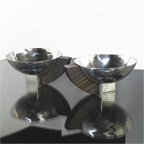 Desny<BR>cups, pair<BR>Maison Desny<BR>France, c. 1935<BR>silverplate, macassar ebony<BR>5"w x 4"d x 2.25"h<BR>Impressed signature to each: [Desny Paris Made in France Metal Argente Depose].<BR><BR><BR><BR><BR>