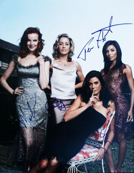 Color satin-finish 11 x 14 cast photo, signed in-person in blue felt tip by Teri Hatcher, Felicity Huffman, Marcia Cross, Eva Longoria and Nicolette Sheridan.