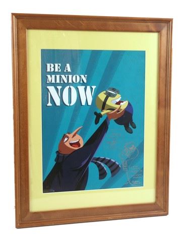 Direct from the promotions department of Universal Studios, comes a framed and autographed drawing of "Gru" played by Steve Carell from the hit animated feature film Despicable Me. It states "Be A Minion Now" and this special drawing collectible is not available to the general public and is in a wood frame with glass cover. Measures approximately 27 1/2" x 21 1/2".