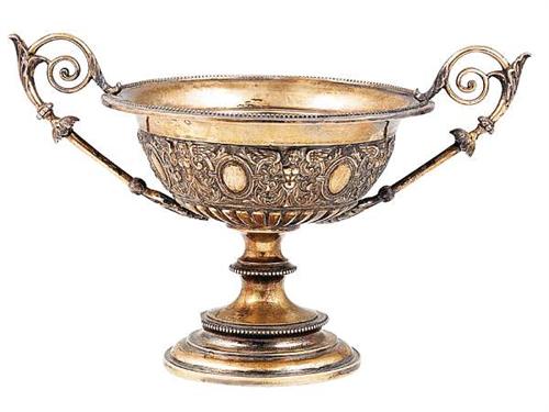 Silver, 220 g, gilt. Round stepped base, bellied bowl. Flanked by cast handles. Dented on the rim. Marked: Austrian, circa 1880, Victor Nuber. Neuwirth: II/87. Size: 12.5 cm
