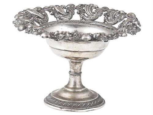 Silver, 176 g. Round base and stem with rolled decoration. On the rim of the bowl there are pressed and pierced decorations. Damaged. Marked: Vienna, 1835, Josef Seidl. Neuwirth: P. 1448. SIZE: 10 cm