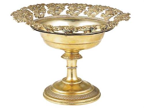 Gilt Silver, 208 gr. Round base and stem with rolled decoration. On the rim of the bowl there are pressed and pierced decorations. Restored by soldering. Marked: Vienna, 1832. Size: 12 cm