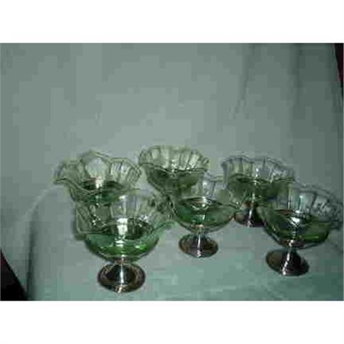 Circa 1930 these dainty and fragile dessert dishes have sterling bases and removable pale green depression glass inserts.One is chipped.Lovely!