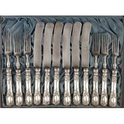 Bécs, 19. sz. utolsó harmada, 1902 elotti vámjeggyel, ezüst nyelek neorokokó kagylós leveles dísszel, fém pengével és villával, dobozában, nettó cca 120 g