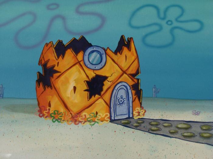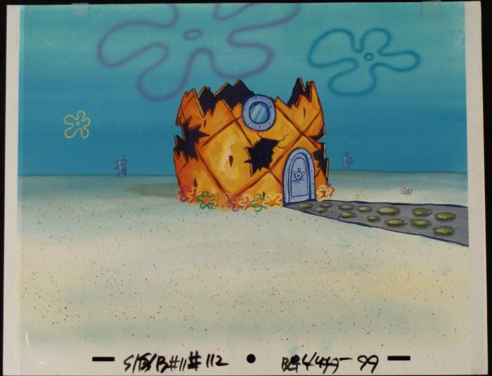 This original hand-painted background and animation cel are from the Nickelodeon TV show SpongeBob Squarepants. The story takes place under the deep blue sea in Bikini Bottom, where SpongeBob resides. SpongeBob, who is a yellow, porous sponge, is your typical happy-go-lucky character, as he is always cheerful and enjoys making people laugh. Patrick Star, SpongeBob's neighbor who is a starfish, is your average children's show idiot, as he boasts knowing nothing and is often getting himself into ridiculous situations. Between the homes of these two lies the home of the miserable Squidward, a squid, who is known for being grouchy and playing tricks on SpongeBob and Patrick. Both SpongeBob and Squidward work at the Krusty Krab, a fast food business run by the greedy money-loving Mr. Krabs, a crab, the arch rival of the evil, possibly misunderstood, Plankton. Another neighbor, Sandy Cheeks, an athletic squirrel who normally wears an astronaut's space suit, was introduced in "Tea at the Treedome." She spends most of her time inventing and experimenting. SpongeBob's house is destroyed.Original Production Background and Animated Cel Overall Size of Background: 10 1/2" x 14" Overall Size of the Cel: 10 1/2" x 12 1/2" Very good condition This is an original hand-painted cel set-up used in the production of an episode of "SpongeBob SquarePants." Each one-of-a-kind set-up represents a slight change in position of the characters. When individually photographed and projected in rapid succession, the images appear to move.