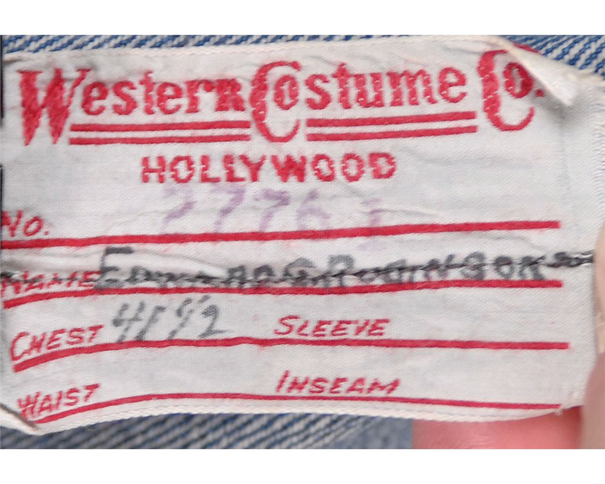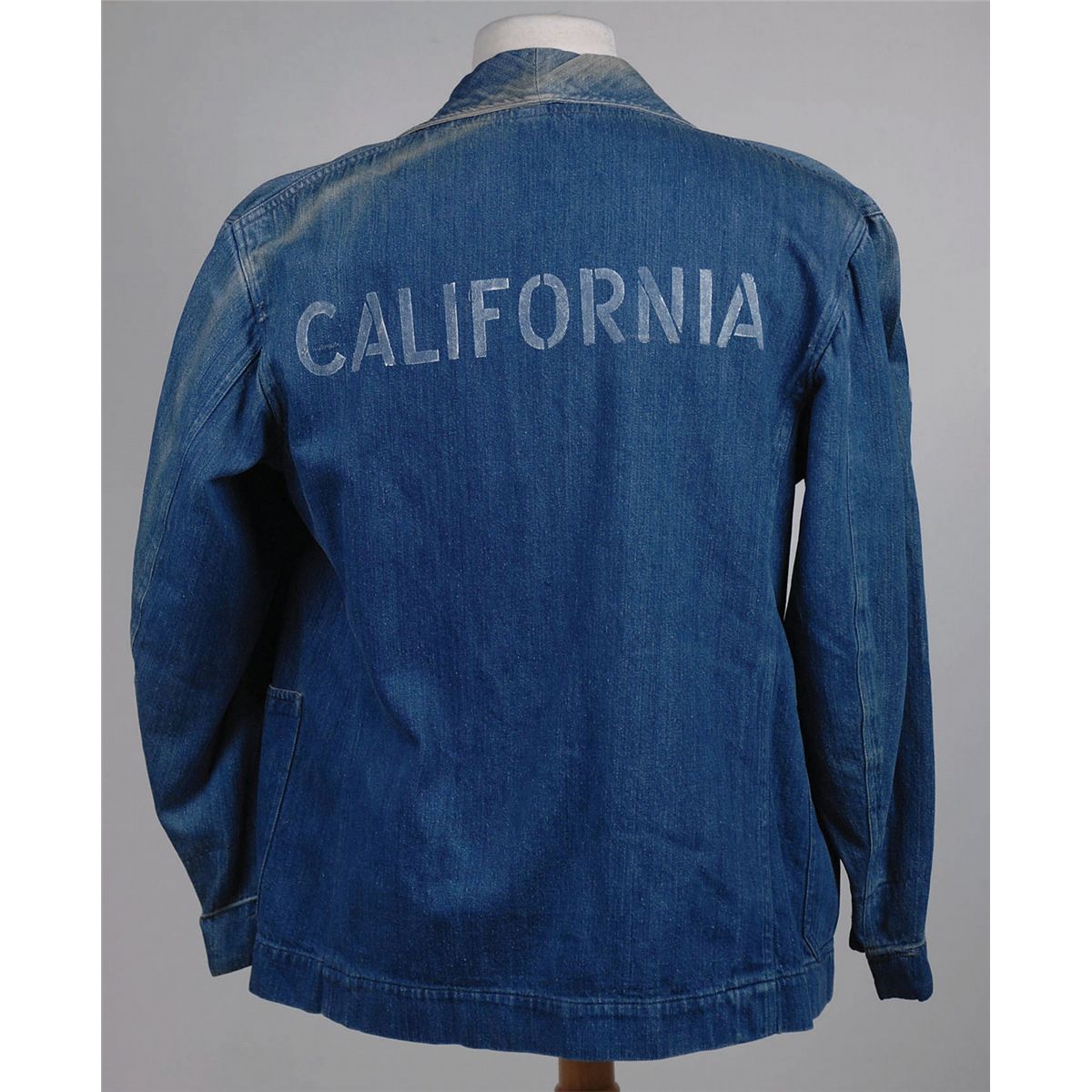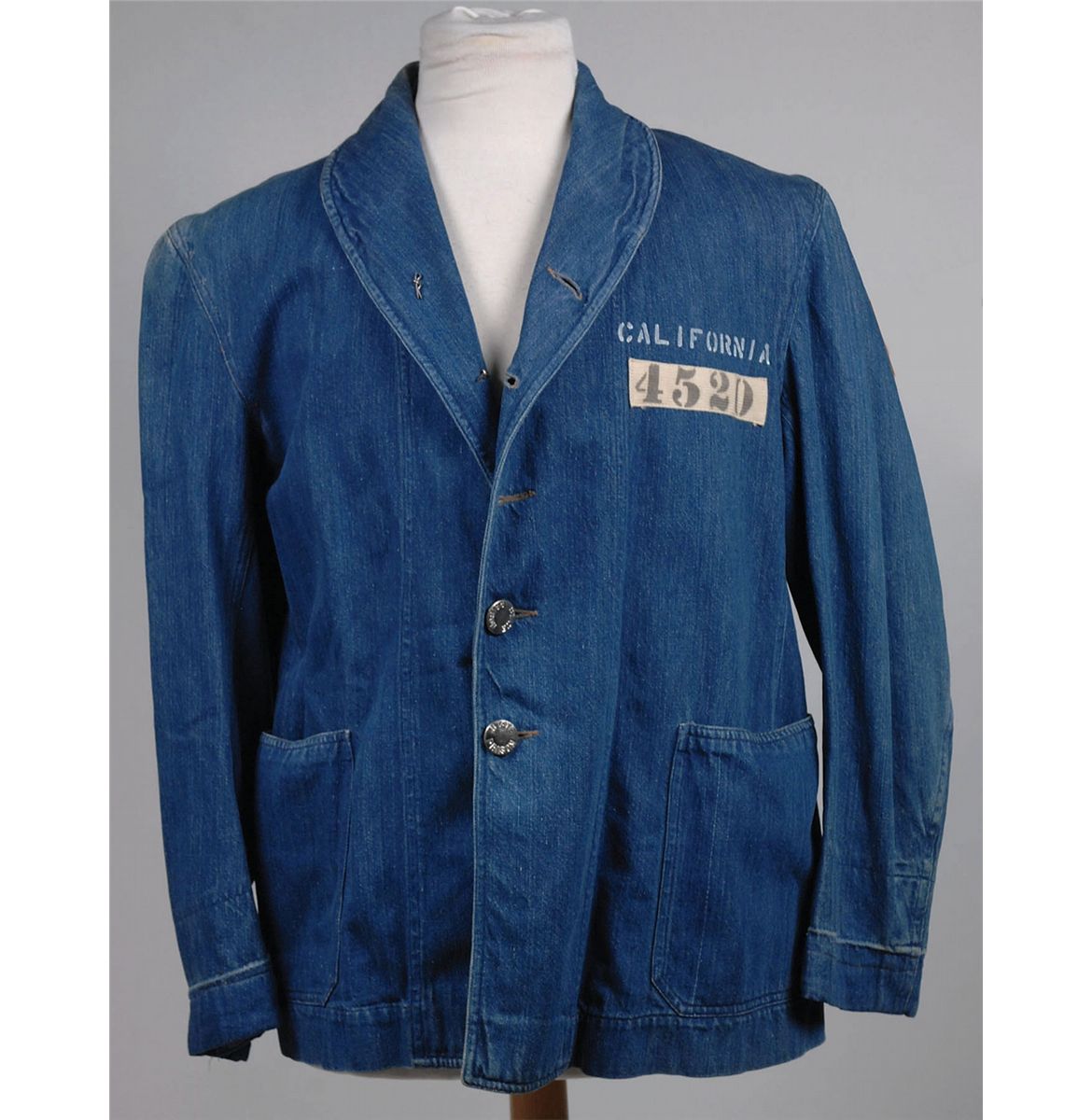 Production-made denim jacket for the 1943 film Destroyer, and later altered for prison-use. Lightweight California State prison jacket retains four of its five State Prison buttons, with a sewn on numerical id patch over the left breast, and stencilled, “California,” above the patch as well as on the back. A Western Costume Co. tag is sewn into the inside, with Robinson’s name written on the second line. In fine condition.
