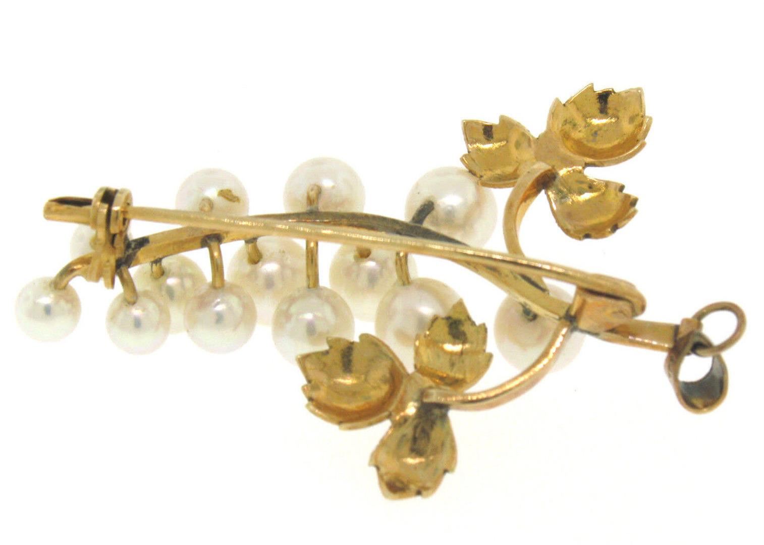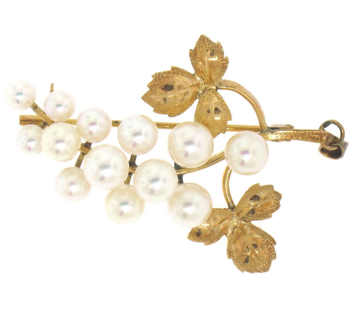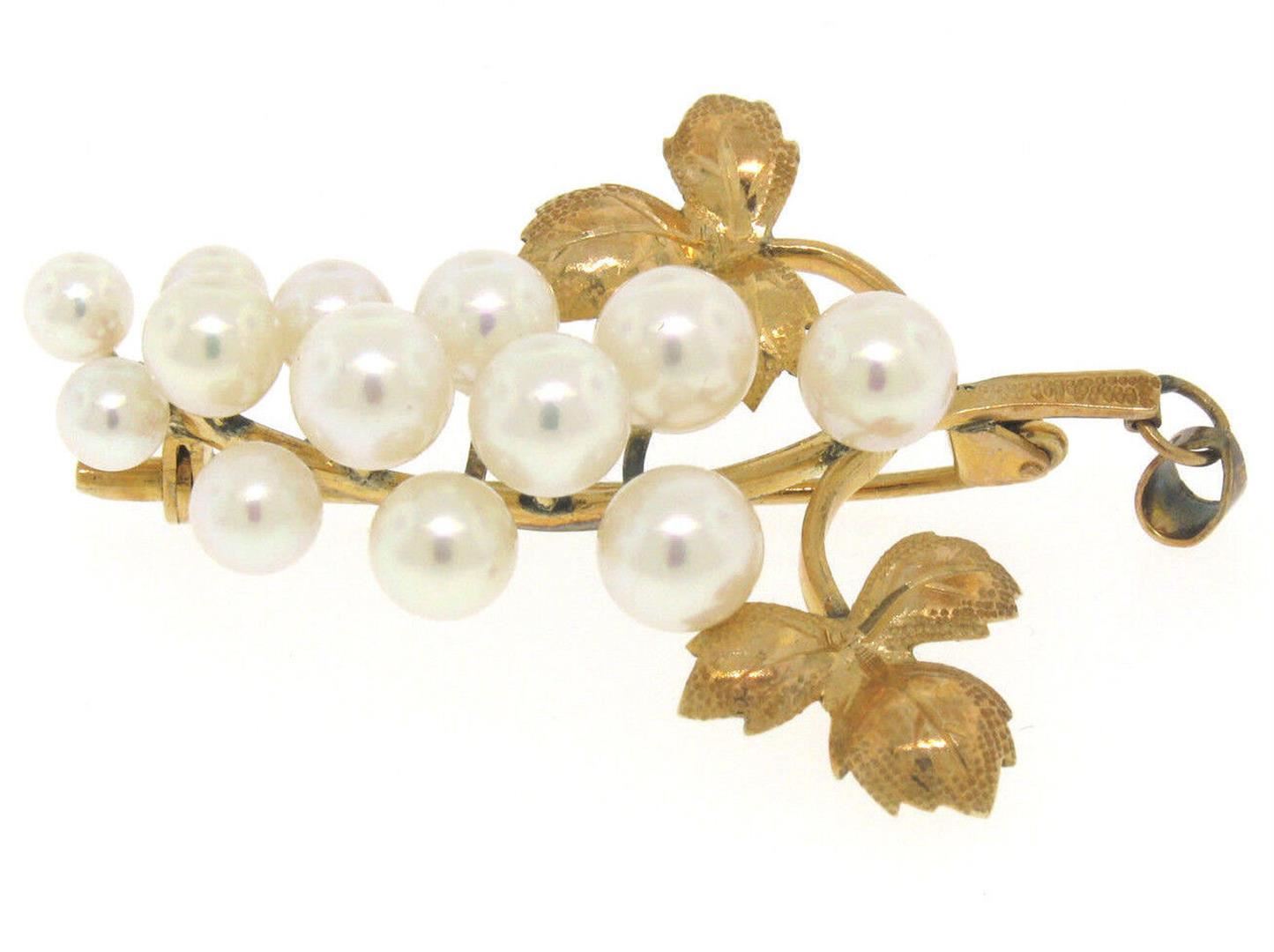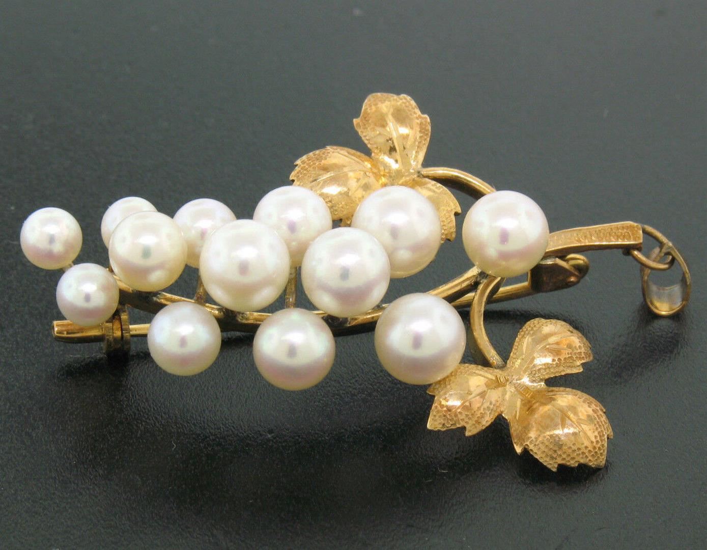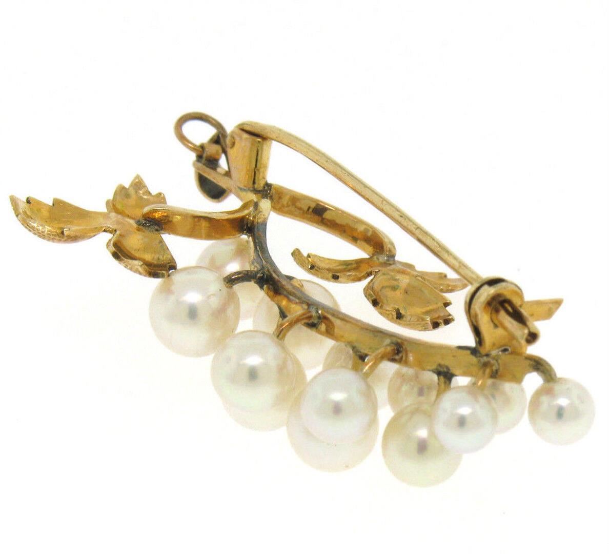 Detailed 14K Yellow Gold Graduated Pearl Grape Cluster Etched Brooch or Pendant. Please see photos and description for all available information. A vintage solid 14k yellow gold brooch pendant, with 13 round shape genuine cultured pearls (4.2-6.1mm). Meas