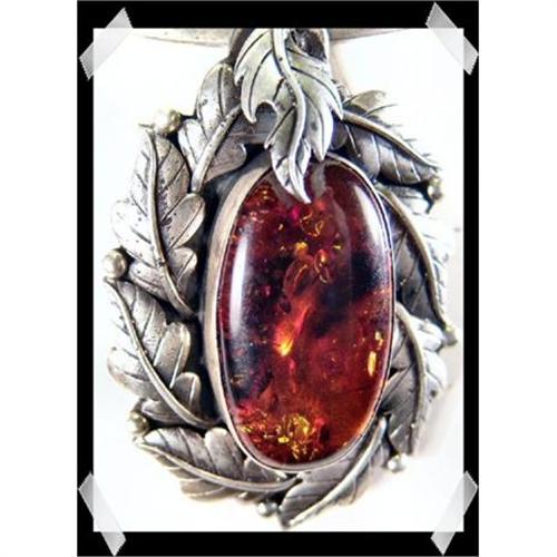 The artist has captured the unique beauty of the amber inspired by nature itself. Gracefully encased in finely detailed sterling leaves this masterpiece lacks nothing. This piece of jewelry will become a sophisticated accent to any gal's wardrobe. The piece is very large with measurements of 60x40x12mm (25mm=1") and a gram weight of 28. <p>