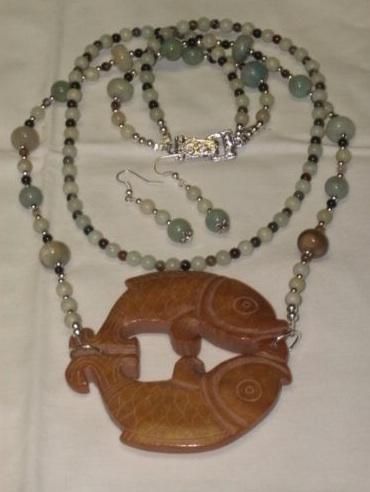 Detailed Hand Carved Fish Pisces Agate & Amazonite 2 Strand Necklace and Earrings, measures 22 inch, two strand, 3 1/8in X 3 1/8in