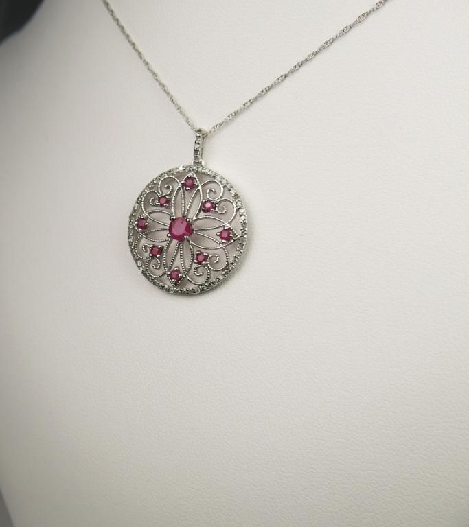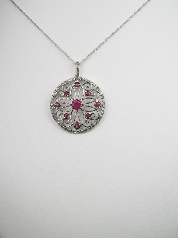 Detailed Mosaic style Ruby and Diamond Pendant with 68 diamonds set in 10 karat white gold. Estimate $500-$800