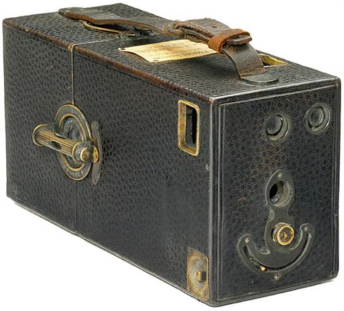 Detective Box Magazine Camera "Frena No. 1" R. & J. Beck, London, fixed focus lens, for filmsheets 25/8 x 31/2 in., rotating shutter and aperture setting. Spirit-level built into the film-changing crank. With case. The camera was a 1st price win of "Petit Français Illustré" to Mademoiselle Germaine Machefer!<Br>