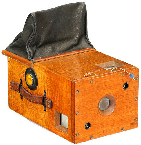 Detektiv-Kamera Hüttig: "Exelsior", 1892 Hüttig, Dresden/Fichtner, für 12 Platten in 6 x 9 cm, Plattenwechsel durch kombiniertes Jalousienschieben und Wechselsack, Nußbaumholz, mit Zählwerk. Gehäusenummer auf Oberseite: 20218, Verschlußspannung und Auslösung über getrennte Züge, funktioniert! Wechselsack wurde fachmännisch erneuert. - Schönes Exemplar!