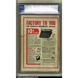 Detective Comics #1 (DC, 1937) CGC GD/VG 3.0 Cream to off-white pages. One of the rarest of all the DC key issues, Detective #1 ranks as the eleventh most valuable Golden Age book. This is particularly impressive when one realizes that its highest Guide value is listed in only VF condition, meaning that a true NM would put the book well into the top ten. DC even named itself after this adventure title, its third ever printed after More Fun and Adventure. Detective is the longest running series in comic history, and, of course, who could forget that wonderful creature of the night #27 introduced to the world. Even in GD/VG, this is one of the best unrestored copies in existence, a further testament to its rarity. Defects include a spine roll, some staining and creasing, and a 1" spine split, but there are no missing pieces, tears or chips, the edges and corners are relatively sharp, and the cover is firmly attached at the staples. This is a truly rare opportunity to obtain a very desirable book, both in grade and historical importance. Overstreet 2002 GD 2.0 value = $8,333; FN 6.0 value = $25,000. Important notice: We expect to be auctioning lots at the rate of 200-250 per hour. Sometimes eBay Premier live bid software cannot keep up with that pace, so we strongly recommend that you place a realistic proxy bid now as insurance to avoid disappointment. Also please note that all Heritage/CAA lots purchased through eBay Premier carry a 20% Buyer's Premium.
