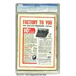 <B>Detective Comics #1 (DC, 1937) CGC GD/VG 3.0 Off-white pages.</B></I> Here's the first issue of the comic book that gave DC its name! <B>Detective</B></I> is the longest-running comic book series of all, having been in continuous publication for 67 years and counting. It was only the third title DC published, following <B>More Fun Comics</B></I> and <B>New Adventure Comics</B></I>. Overstreet ranks the premiere issue among the 15 most valuable comic books of all. That's if you can get your hands on one: Overstreet and Gerber both term the issue "scarce." Adding to its significance, it's the first successful comic book ever to be devoted to a single theme. That theme was of course detection, and too many gumshoes to list made their first appearances here. The most notable was hard-boiled private eye Slam Bradley, who was a regular in the comic for the next ten years. He was created by none other than Superman creators Jerry Siegel and Joe Shuster. Other artists in the issue are Creig Flessel, Fred Guardineer, and Paul Gustavson. A word about the cover: the character is often mistaken for Fu Manchu, and though that Sax Rohmer character did appear in later issues of <B>Detective</B></I>, the fellow you see here is Chin Lung, drawn by Vincent Sullivan. This is one of only three unrestored copies that CGC has certified to date. CGC notes, "Cover detached." Overstreet 2004 GD 2.0 value = $8,333; VG 4.0 value = $16,000. <BR><BR><B>Important notice:</B> Heritage usually auctions material at the rate of 200-250 lots per hour. On some occasions eBay Live bid software or the Internet may not be able to keep up with the pace of the auction. We recommend placing a realistic absentee bid now as insurance to avoid disappointment. Occasionally the auctioneer may eliminate or reject an eBay Live bid, and the auctioneer may also reopen a lot after the close of the eBay live bidding (usually because we missed an audience bid), and may reject your bid even if it shows you as the winning bidder. By bidding via eBay Live, you agree that Heritage may award the lot to another bidder at its sole discretion under the circumstances described above or any other reasonable circumstances. Since eBay bids are not shown to us until we open the lot on the floor, we treat those bids just like floor bids. In most cases the floor responds before the eBay bid is presented to us, due to Internet lag time, so for consistency we have made it a policy that floor bids are always considered first over tie eBay live bids. Also please note that all Heritage lots purchased through eBay Live carry a 20% Buyer's Premium. Please make sure you read the Terms and Conditions before you bid.