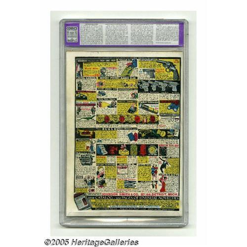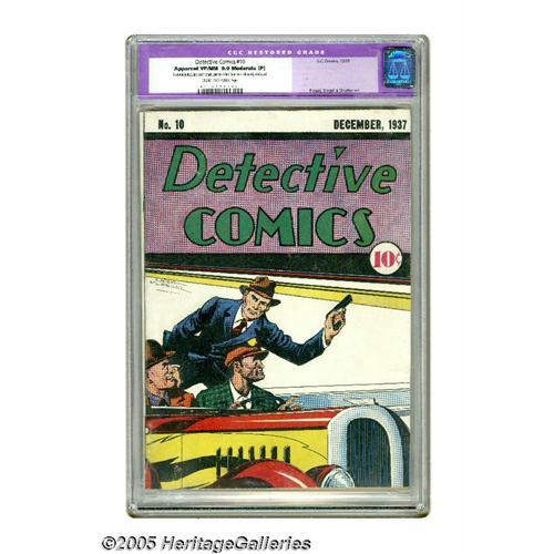 <B>Detective Comics #10 (DC, 1937) CGC Apparent VF/NM 9.0 Moderate (P) Cream to off-white pages.</B></I> This pre-Golden Age DC issue sports a great Creig Flessel cover. The book's interior artists include Flessel, Joe Shuster, and Sven Elven. True detectives ruled the series in these pre-Batman days; featured characters included Slam Bradley, Speed Saunders, and Handcuff Hawkins. CGC notes, ""Restoration includes: color touch, pieces added, tear seals, cleaned, reinforced."" Overstreet 2005 GD 2.0 value = $688; VG 4.0 value = $1,376; FN 6.0 value = $2,064; VF 8.0 value = $3,440; VF/NM 9.0 value = $4,620. <BR><BR><B>Important notice:</B> Heritage usually auctions material at the rate of 200-250 lots per hour. On some occasions eBay Live bid software or the Internet may not be able to keep up with the pace of the auction. We recommend placing a realistic absentee bid now as insurance to avoid disappointment. Occasionally the auctioneer may eliminate or reject an eBay Live bid, and the auctioneer may also reopen a lot after the close of the eBay live bidding (usually because we missed an audience bid), and may reject your bid even if it shows you as the winning bidder. By bidding via eBay Live, you agree that Heritage may award the lot to another bidder at its sole discretion under the circumstances described above or any other reasonable circumstances. Since eBay bids are not shown to us until we open the lot on the floor, we treat those bids just like floor bids. In most cases the floor responds before the eBay bid is presented to us, due to Internet lag time, so for consistency we have made it a policy that floor bids are always considered first over tie eBay live bids. Also please note that all Heritage lots purchased through eBay Live carry a 20% Buyer's Premium. Please make sure you read the Terms and Conditions before you bid. This lot is being auctioned in conjunction with a live floor auction by Heritage Galleries & Auctioneers. All final auction and invoice