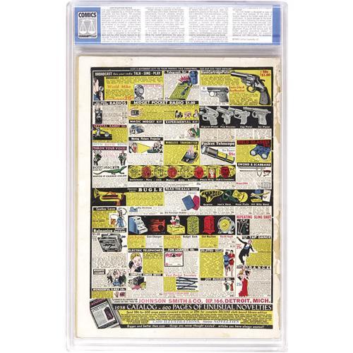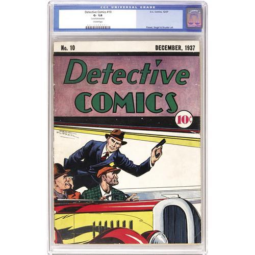 <B>Detective Comics #10 (DC, 1938) CGC GD- 1.8 Cream pages.</B></I> One of the reasons early issues of this and other DC titles are so prized is the cover artistry of Creig Flessel, who also provided interior art on this issue. CGC notes, "Centerfold detached." Overstreet 2006 GD 2.0 value = $688. CGC census 7/06: 1 in 1.8, 5 higher. <I>From the collection of Patrick Marchbanks.</B></I> <BR><BR><B>Important notice:</B> Heritage usually auctions material at the rate of 200-250 lots per hour. On some occasions eBay Live bid software or the Internet may not be able to keep up with the pace of the auction. We recommend placing a realistic absentee bid now as insurance to avoid disappointment. Occasionally the auctioneer may eliminate or reject an eBay Live bid, and the auctioneer may also reopen a lot after the close of the eBay live bidding (usually because we missed an audience bid), and may reject your bid even if it shows you as the winning bidder. By bidding via eBay Live, you agree that Heritage may award the lot to another bidder at its sole discretion under the circumstances described above or any other reasonable circumstances. Since eBay bids are not shown to us until we open the lot on the floor, we treat those bids just like floor bids. In most cases the floor responds before the eBay bid is presented to us, due to Internet lag time, so for consistency we have made it a policy that floor bids are always considered first over tie eBay live bids. Also please note that all Heritage lots purchased through eBay Live carry a 22.5% Buyer's Premium. Please make sure you read the Terms and Conditions before you bid. This lot is being auctioned in conjunction with a live floor auction by Heritage Auction Galleries. All final auction and invoice information will be supplied by Heritage Auction Galleries, and all other information should be considered preliminary. Lot:41001 <BR><BR><B>Winning Notification and Billing:</B> After the FINAL session in this auction is complete, Heritage will send e-mail and snail mail invoices. This process normally takes several days. All final auction and invoice information will be supplied by Heritage Auction Galleries, and all other information should be considered preliminary. <BR><BR>This auction will be conducted on a live auction floor and over the Internet through eBay Live. If you choose to place an absentee bid, please take a moment to <font color='#0000ff'><u><a href='http://pages.ebay.com/liveauctions/help/before/laabsentee.html'>learn how eBay Live absentee bidding works</a></u></font><font color='#000000'>