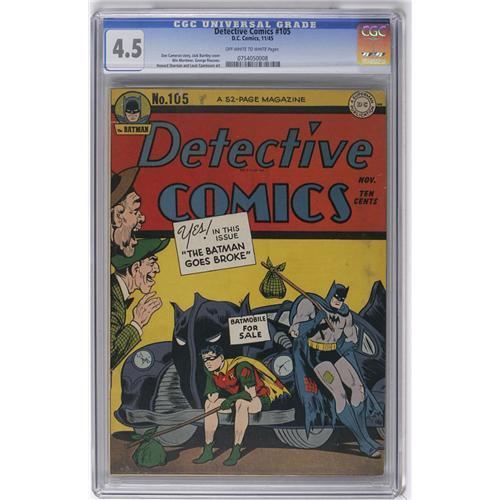 <B>Detective Comics #105 (DC, 1945) CGC VG+ 4.5 Off-white to white pages.</B></I> Jack Burnley cover. Overstreet 2006 VG 4.0 value = $146. CGC census 1/06: 1 in 4.5, 7 higher. <I>From the Collection of Harold Curtis.</B></I>