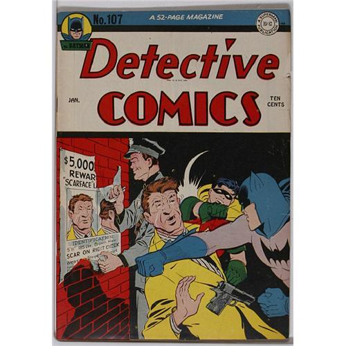 <B>Detective Comics #107 (DC, 1946) Condition: VG/FN.</B></I> Dick Sprang cover. Air Wave, Boy Commandos, and Slam Bradley backup features. Could not be encapsulated by CGC because of an overhang. Overstreet 2006 VG 4.0 value = $146; FN 6.0 value = $219. <I>From the Collection of Harold Curtis.</B></I>